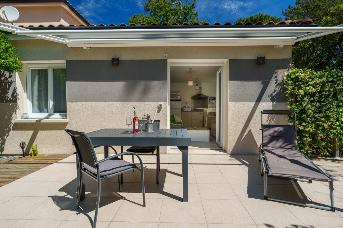Duplex 30 m2, accolé à la maison du propriétaire-accès indépendant. Rdc : kitchenette(frigo, micro ondes, mini four, plaque cuisson, cafetière) coin repas et canapé, Wc. Etage : 1 chambre lit double (possibilité lit bébé, accès enfant sécurisé), salle d'eau avec douche et double vasque. Cour avec table et chaises de jardin. Abri à vélos et motos. Marché et commerces à 100 m à pieds. Accès à pieds au port de plaisance et au chenal de la Cayenne, restaurants, cité de l'huitres. Promenades à vélos