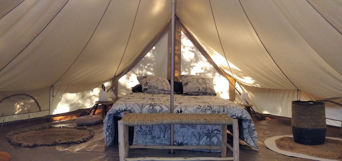 Camping pratique : Apportez seulement vos duvets ! A l’ombre des arbres 2 tentes de 4 pers. (2 matelas de 140X190cm avec housse et oreillers avec taies) installées sur une plateforme en bois sur pilotis + salon de jardin . L'ensemble peut accueillir jusqu'à 8 pers, MINIMUM 4 PERSONNES. Même si vous n'occupez pas tout, nous n'ajouterons jamais d'autres personnes. Intimité préservée. Vous êtes moins de 4 ? Notre "prêt-à-camper" Bois Charmant sera idéal pour vous ! (voir autre annonce).