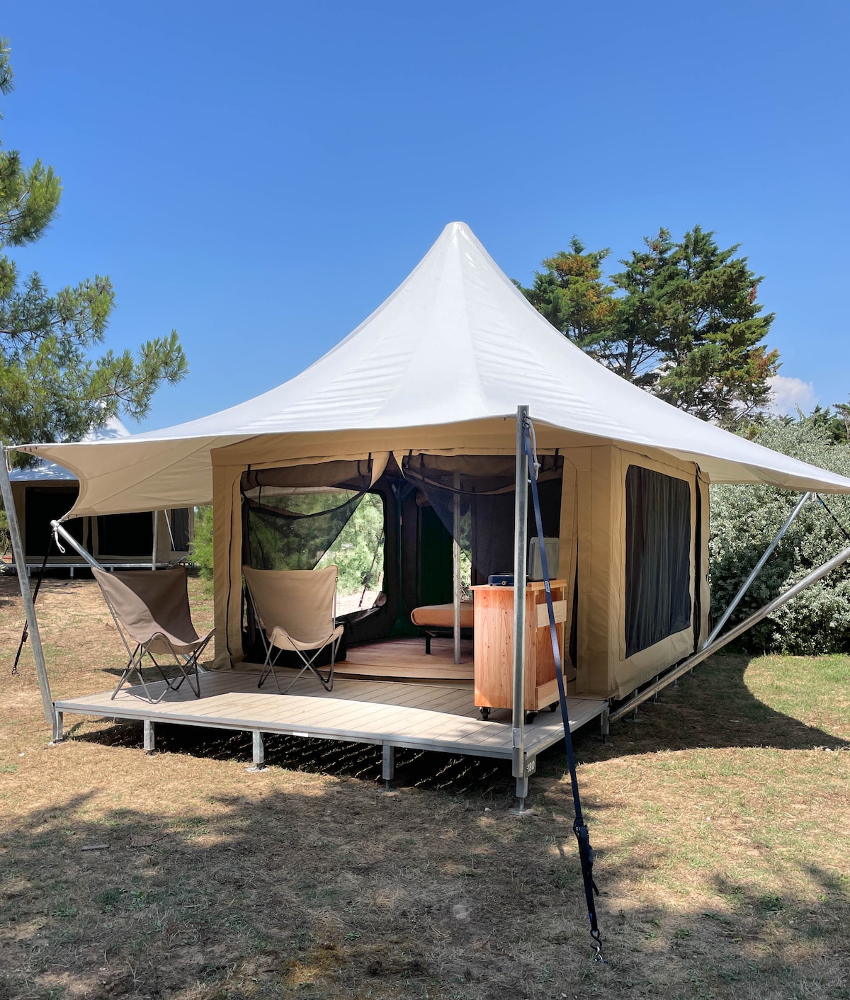 Situé à 20 minutes de la Rochelle et implanté sur l'îlot du Château du Petit Mazurié, notre lodge spacieux et élégant est le lieu idéal pour des vacances de rêve en famille ou entre amis ! Dans la tente Elisabeth, vous pourrez profiter d'un salon cosy et d'une cuisine ouverte. Une chambre parentale (lit 160 x 200 cm) Une chambre en mezzanine (4 lits 90×200 cm) Salle d’eau et wc séparé. Une terrasse couverte de 23 m² Frais de ménage 80 €