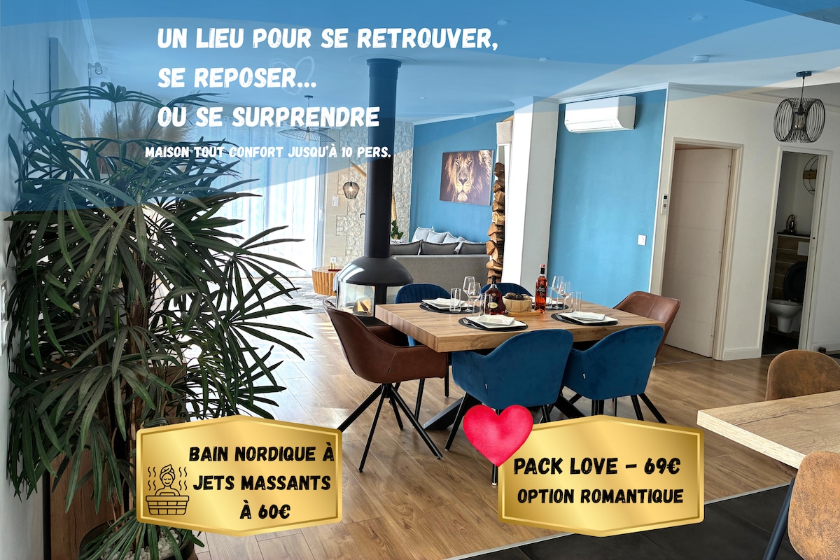 Belle maison de type loft 180 m2. Vous trouverez au rez de chaussez une cuisine entièrement équipée (four, micro ondes, machine à laver, sèche linge), coin repas, la salle d'eau (douche à l'italienne,wc) ainsi qu'un espace détente avec cheminée et jacuzzi (4 personnes max). A l'étage, vous profiterez du Sauna, d'un premier lit en 140 avec un coin eau+wc, d'une chambre avec lit en 160 ainsi qu'un salon avec tv. A l'extérieur : terrasse, et piscine chauffée (mai /sept) Coin barbecue .