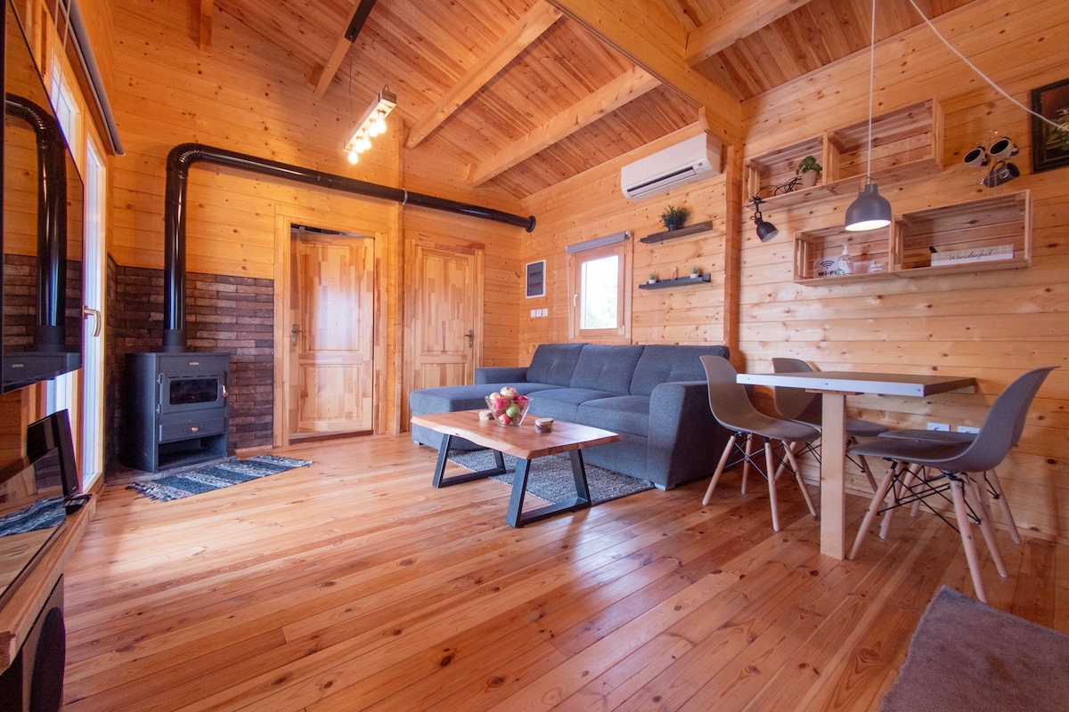 Our wooden home has been built with one thing in mind. Calmness and peace. Here you will have the chance to relax and enjoy nature. The house has a fully equipped kitchen. A full-size fridge, oven, microwave as well as an espresso coffeemaker. The bathroom is spacious and offers a rain-shower. The bedroom has an attic with a single bed, a double bed, a closet as well as a small desk. The main area, the living room has a four-seat comfortable sofa, a TV, and a wood-stove. EV charger available.