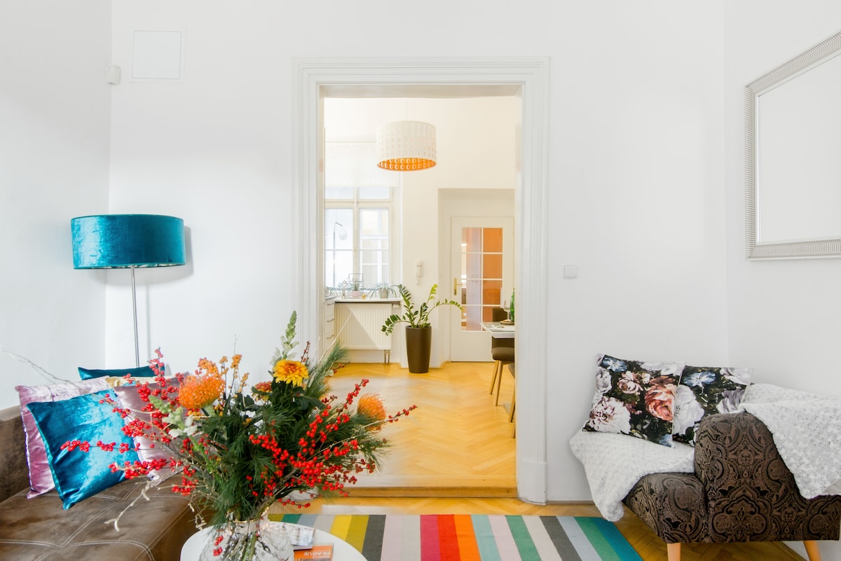 Enjoy staying in my beautiful Art Nouveau home built during the 1890s but with all the modern amenities one could wish for. Thoughtfully renovated two-bedroom apartment with large ample rooms featuring historically high ceilings decorated in ornate stucco moldings, queen-size beds, high-speed internet, and a large spacious walk-in rain shower. The ideal place to call home while in Prague for either a long weekend, a business trip, or why not a long stay. Let my reviews speak for themselves!