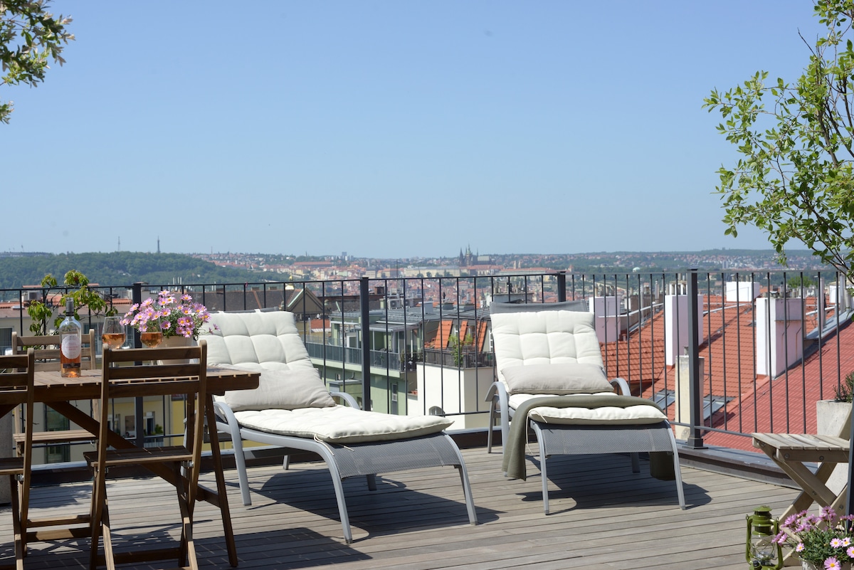 A totally wonderful and unbelievably beautiful place. Touch the sky. Touch the stars from the roof penthouse!!! It is so extraordinary that it used to be popular even with foreign diplomats and film stars.Besides comfort of an exceptional level, this newly refurbished and equipped penthouse provides amazing views of the whole Prague City and its most significant sights. Enjoy the views of Prague Castle, Old Town Square and the mini Eiffel Tower from the amazing jacuzzi directly under the star...