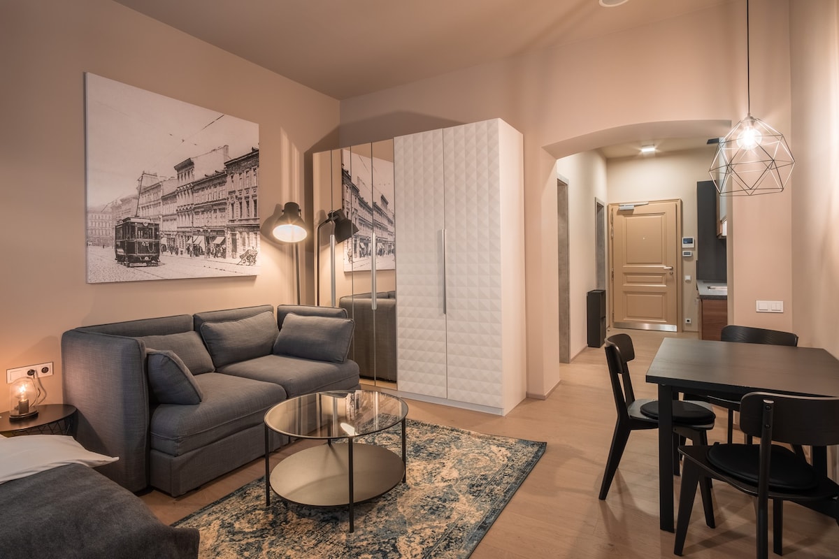 Experience the brand new stylish fully furnished apartments designed by renowned architectural studio Nedvěd Architekti where you can find everything from comfortable beds to towels and coffee cups. The carefully renovated building has preserved the best of history and added everything that modern housing requires. Make yourself comfortable! • 5 minutes to the heart of Prague • 80 meters to the nearest café • 1 stop from the main railway station • Steps away from metro and tram