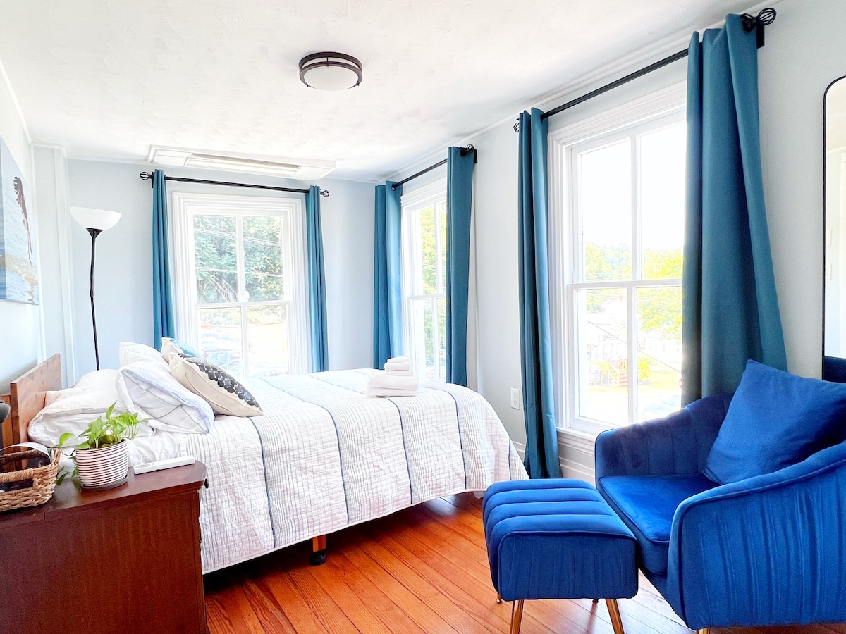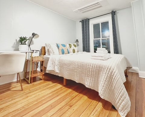 Welcome to our recently remodeled home in downtown Occoquan, VA. The house was built in 1901 features original windows. Please note all bedroom windows are not be able to open. All living quarter and bedrooms are located on the second floor. There are 3 bedrooms availabel for short-term stay. This listing is one of our economical guest bedrooms. The room is wrapped around with tall vintage windows. Featuring queen bed with soft & comfortable bedding, extra pillows and desk & chair.