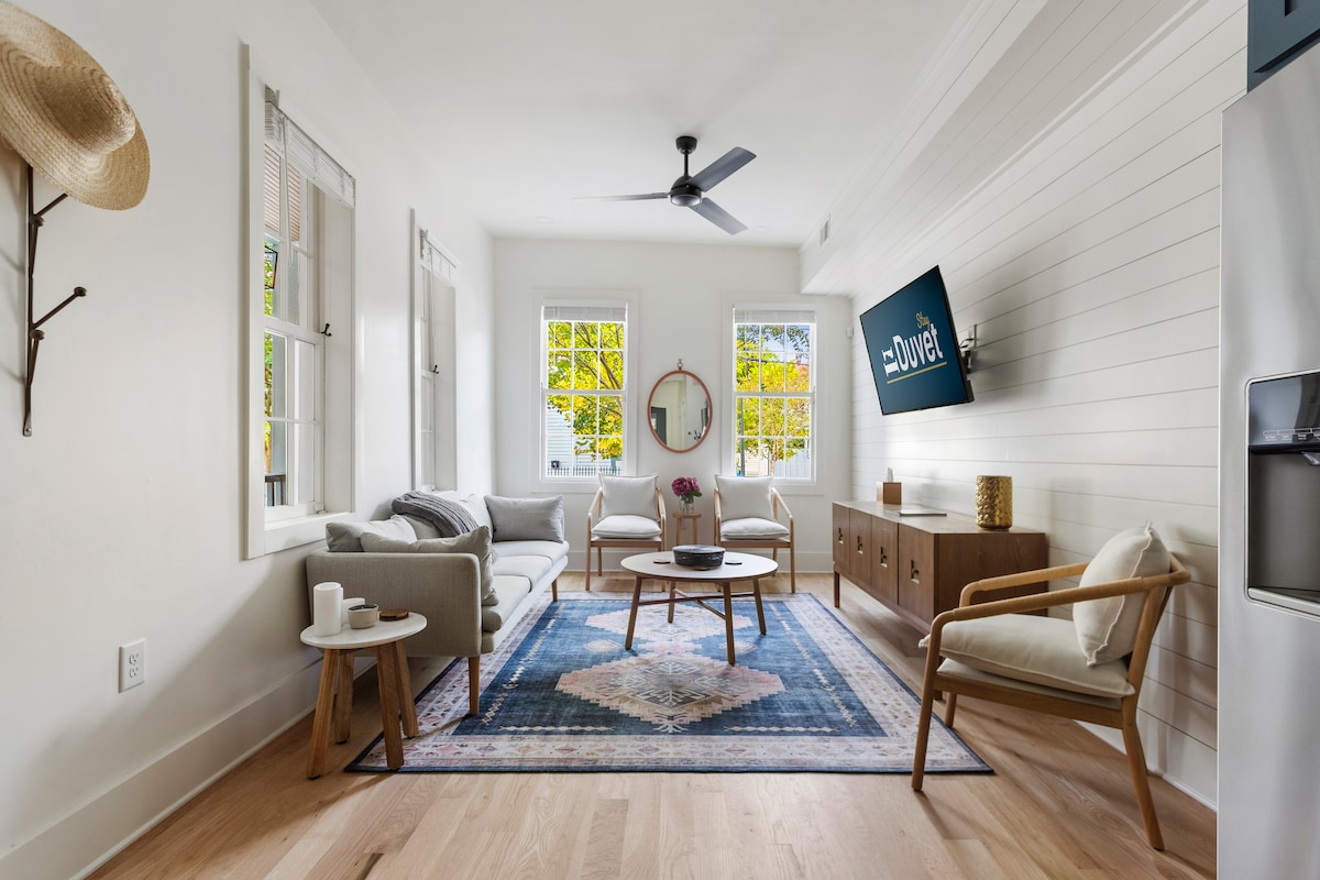 Turn back time in this refined historic Charleston residence (OP2025-06356). Soaring 12-ft ceilings, polished wood floors, and grand sash windows set the tone for an elegant retreat. A master bedroom and curtained sunroom each offer king beds for flexible sleeping. Located in a quiet, walkable historic downtown neighborhood. Perfect for couples or a sophisticated girls’ weekend. Private entrance, thoughtfully designed 1,000 sq. ft. interior. Exclusive off-street parking with EV charger.