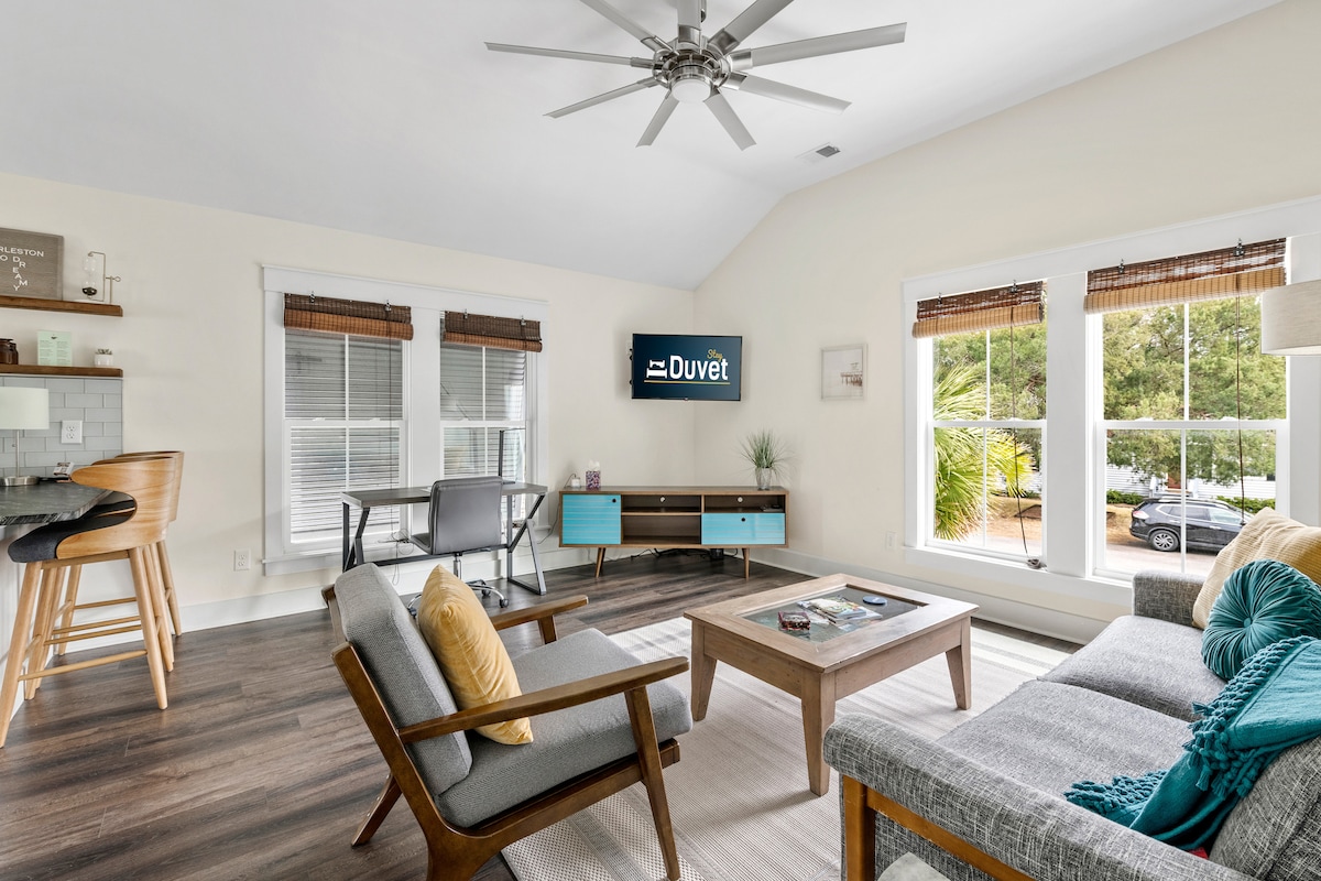 Relax in this separate guest home nestled in a well-established Lowcountry neighborhood. The ‘treehouse’ has an open-plan design with vaulted notched board ceilings, creating a feeling of light and space, with elegant furnishings throughout. The well-equipped kitchen and grill on the porch encourages intimate home cooking. We lived in this space before we moved into the main house, so we can attest to it being comfortable, and well maintained.