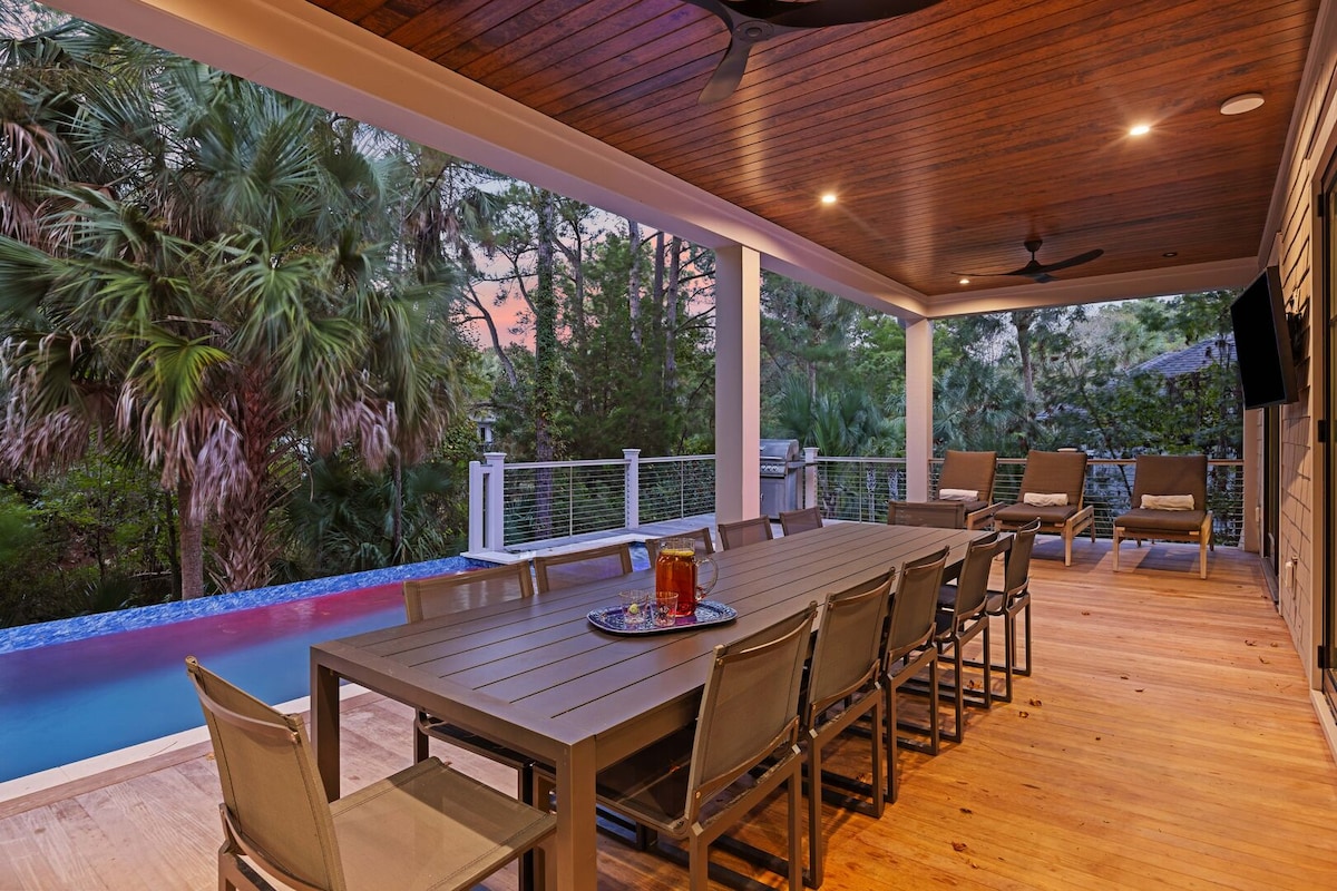 Nestled amongst greenery in Isle of Palms, this home features everything you need for a laid-back getaway. The heart of town is nearby where you’ll discover restaurants, shops, and must-try ice cream. Heat up in the midday sun before plunging into the ample pool. A short stroll is all it takes to land you at the beach. Perhaps you’ll catch a glimpse of sea turtles as you meander along the shore. Copyright © Luxury Retreats. All rights reserved.