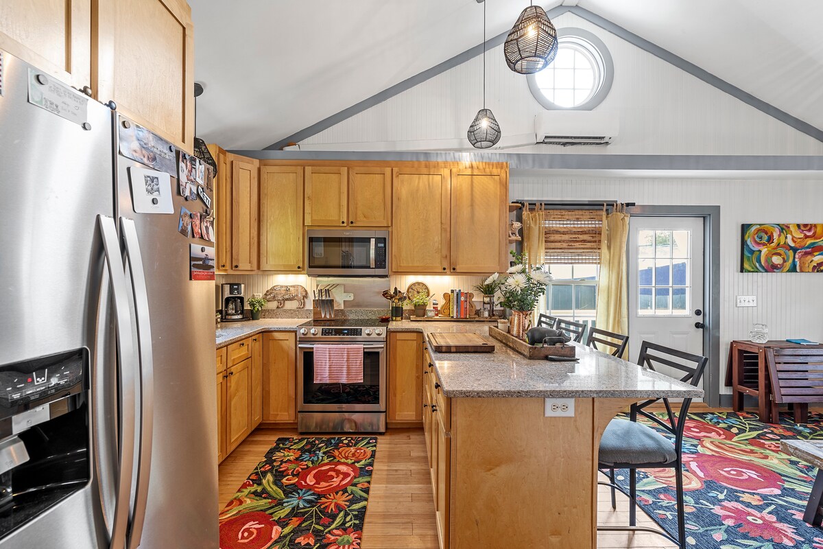 Relax in this separate guest home nestled in a well-established Lowcountry neighborhood. The ‘treehouse’ has an open-plan design with vaulted notched board ceilings, creating a feeling of light and space, with elegant furnishings throughout. The well-equipped kitchen and grill on the porch encourages intimate home cooking. We lived in this space before we moved into the main house, so we can attest to it being comfortable, and well maintained.