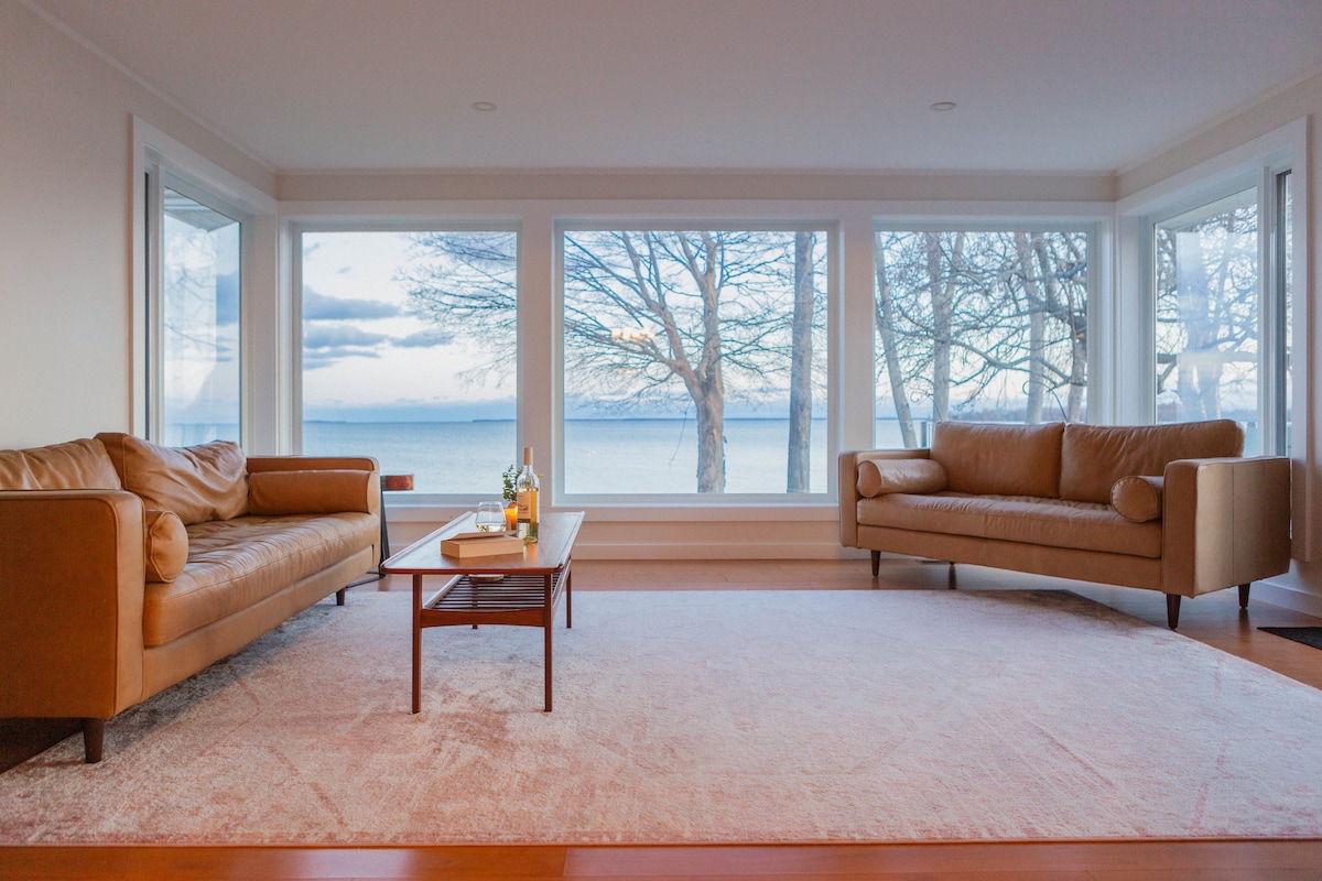 This gorgeous open concept waterfront home with wall of windows overlooking the bay was designed by the homeowners themselves and it's clear how much love they put into it. Decorated in a retro vibe with European elements, the cozy reading nooks, king beds, sauna & wonderful fireplace ensure your family will feel they've escaped into paradise. Personal watercraft are available for your use in the summer and hot tub all year round.