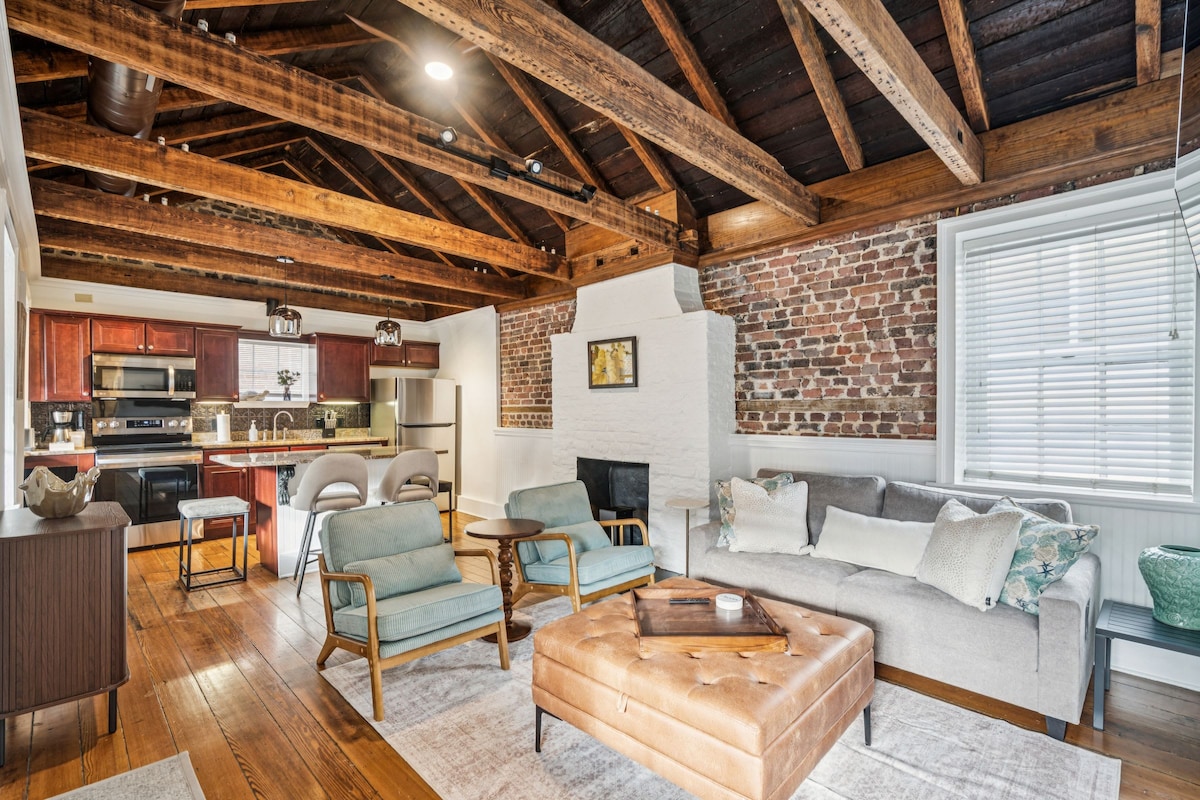 This fully remodeled second-floor apartment in a historic two-story home combines modern comfort with original charm, featuring exposed ceiling beams and classic woodwork. Just steps away from top restaurants and bars, and a 5-minute walk to the lively King Street, it's perfectly situated. Enjoy cocktails on the veranda or in the shared backyard. The unit is dog-friendly and accessible via stairs. Includes one off-site parking space (a 3-minute walk away) and offers 300 Mbps WiFi.