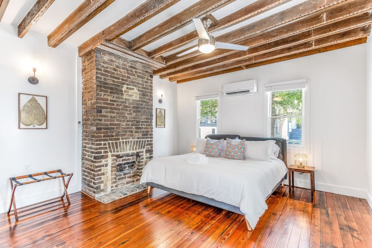 Turn back time, in this historical home, downtown Charleston, waltzing across polished wood floors past huge sash windows in a period loft. Heritage colors, design, and a mix of new and traditional pieces like an old-fashioned writing bureau add to the grandeur of 12-foot ceilings and original fireplaces. Ideal for a Couple, on a romantic getaway or a girls weekend in the top city of Charleston. Private, spacious 1,000 sq. ft. Private, off-street Parking with EV charger. Permit: OP2025-06356