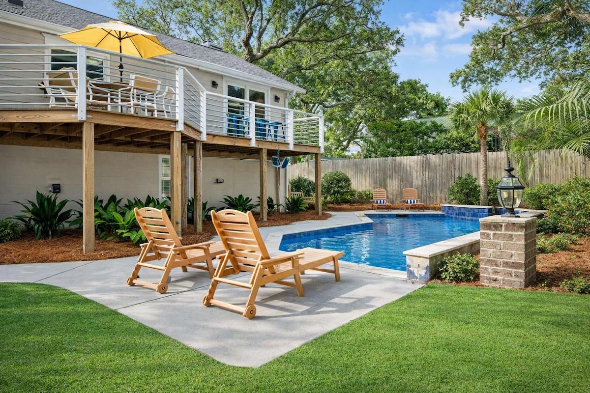 Steps from the beach on Isle of Palms, Palmetto Pearl is a lush private oasis for up to 10+ guests. This charming retreat features a private pool, an expansive backyard with a BBQ, a game room with a pool table and 5 cruiser bikes. Enjoy the perfect blend of relaxation and fun in this spacious, light-filled home, just a short walk from the ocean. Ideal for families and groups seeking a memorable beach vacation.