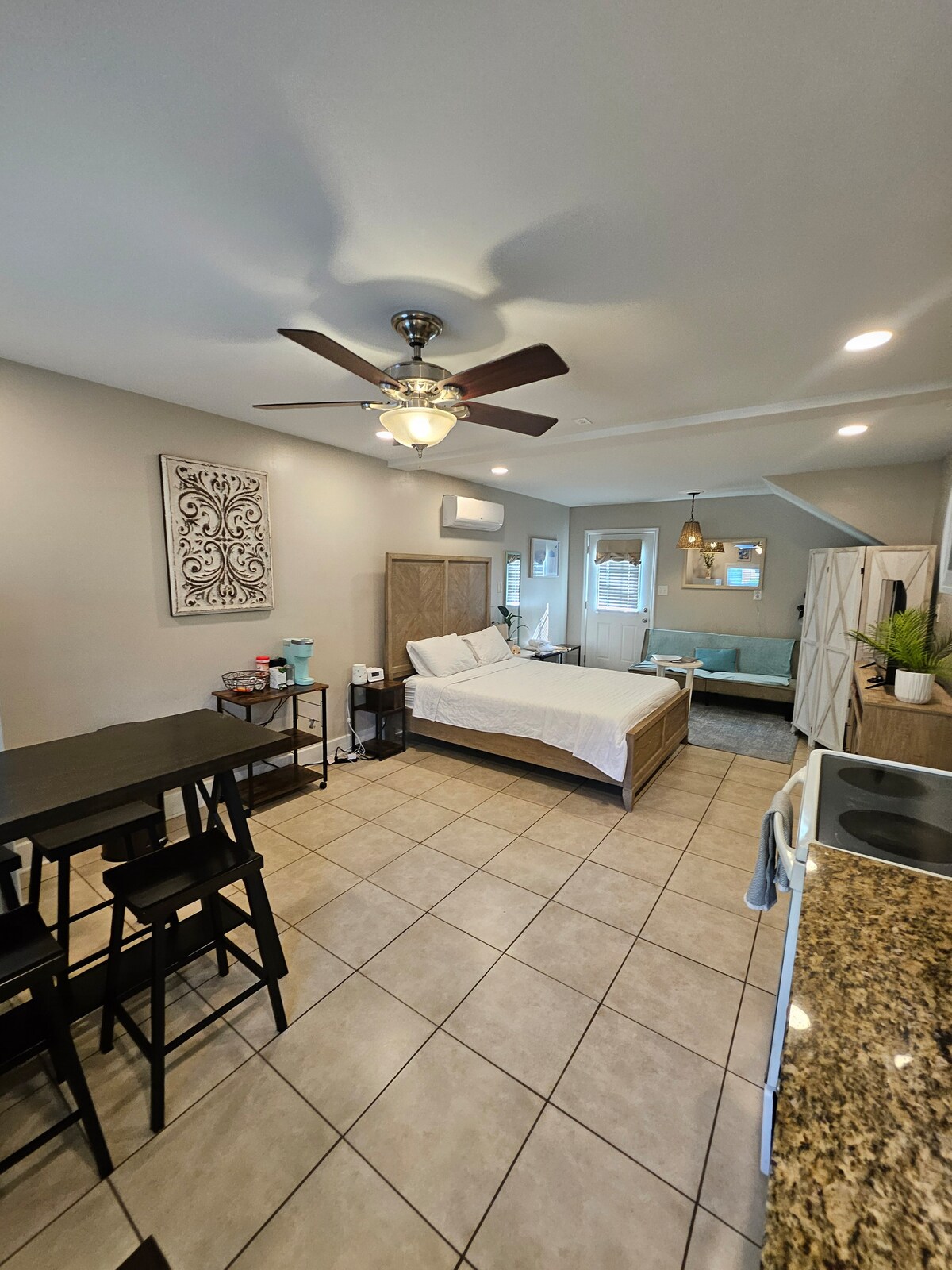 A few miles from historic & scenic downtown Charleston and Folly Beach this is the ideal location for your next vacation! You will enjoy complete privacy with a separate entry. Bedroom consists of Queen bed, dresser, armoire and library. You will love the walk-in shower complete with ceiling-to-floor tile. Comfortable living room with a sofa, two chairs, TV (Firestick only), kitchenette with small dining table, refrigerator, microwave, and convection oven for your use. Wi-fi available.