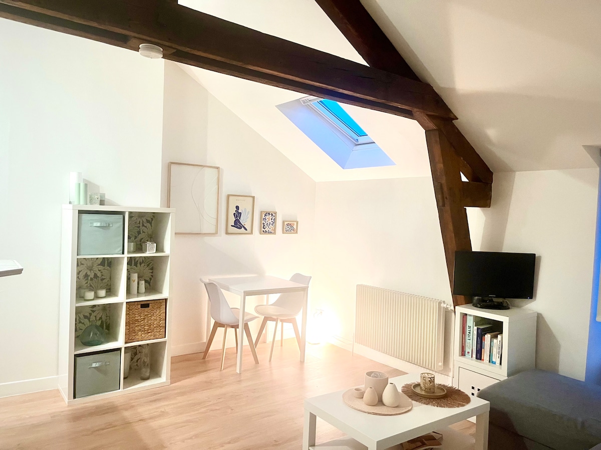 Appartement atypique hyper centre "prêt à vivre" de 37 m2 disposant d'une cuisine équipée d'un four, d'un micro onde, cafetière senséo, grille pain, vitro céramique, bouilloire etc... Un séjour avec TV, canapé BZ, table. Une chambre (lit 160x200). Stationnement et commerces à proximité. Arrêt de bus à 20m. Centre ville à 2 minutes à pied. Situé au premier étage d'une petite copropriété. Draps du lit deux personnes compris. Duvet et draps non compris pour le BZ. Serviettes non comprises.
