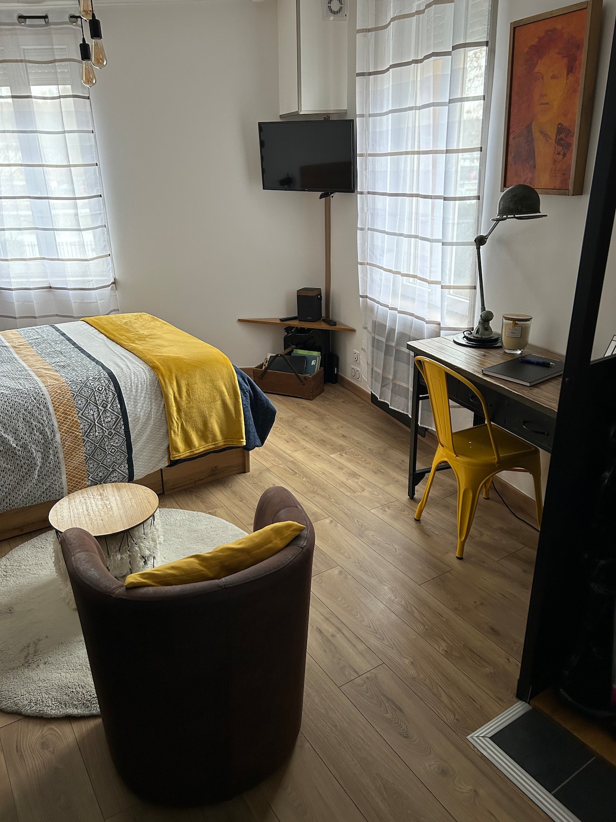 Venez séjourner au calme tout en bénéficiant de la proximité des commerces environnants. Nous sommes situés à moins de 5 minutes du centre historique de Sedan et de son château médiéval (monument préféré des Français). Le studio est spacieux et lumineux, ouvert sur une terrasse couverte par une pergola, avec vue sur le parc. Chambre avec petite cuisine et espace repas, TV. Salle d'eau avec WC. Le studio dispose d'une entrée indépendante.