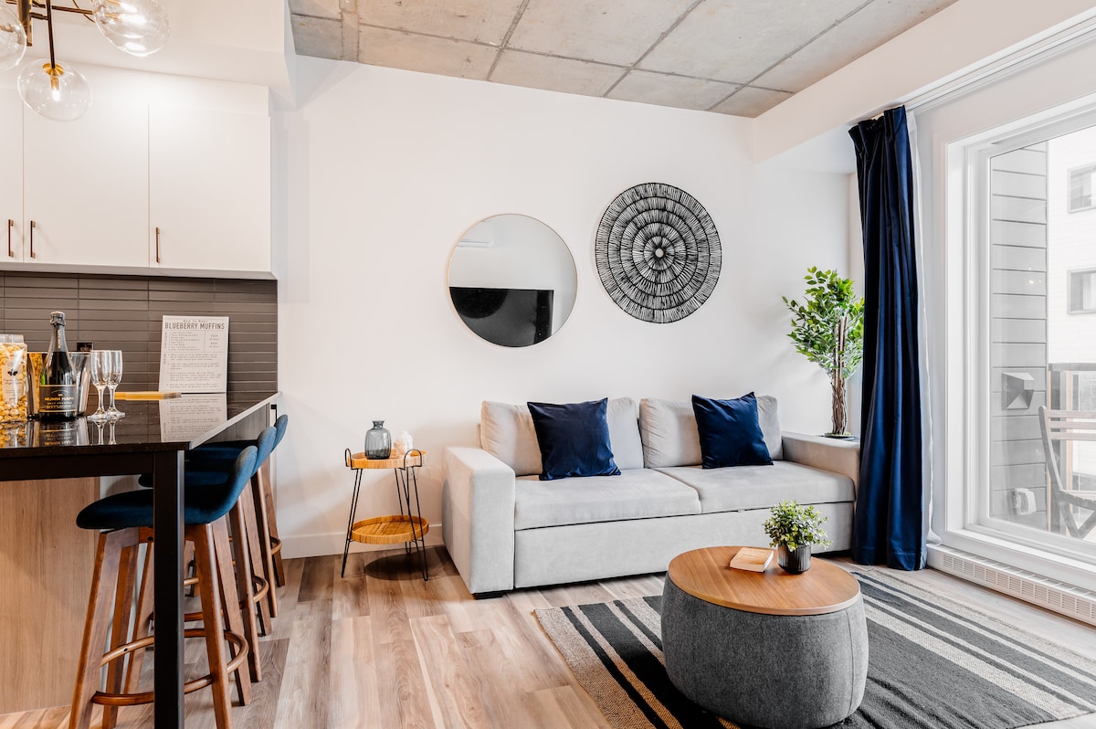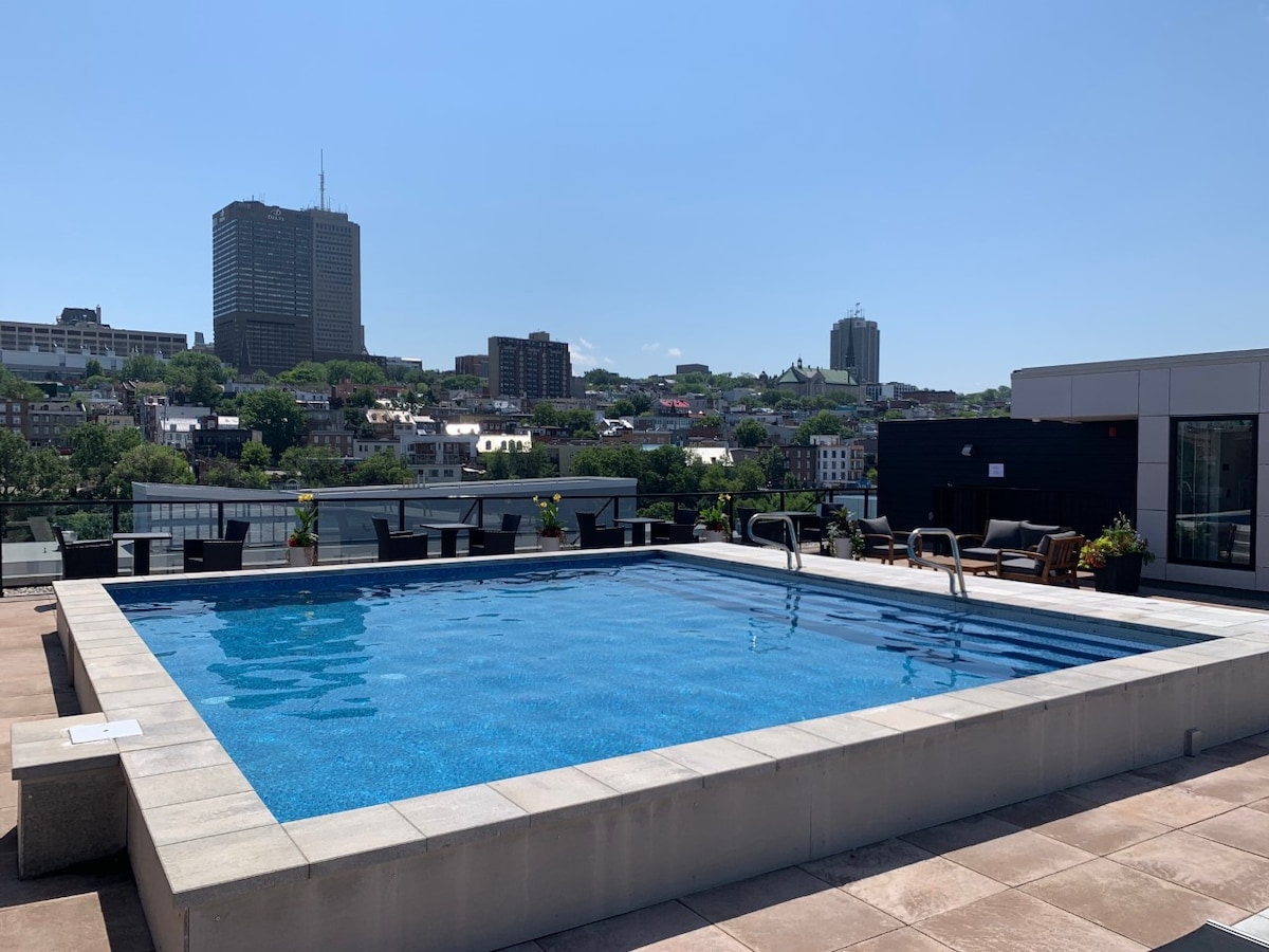 Come and enjoy an unforgettable stay in the heart of the Saint-Roch district in Quebec City. This modern and luxurious condo will charm you as much by its common spaces as by its interior design. ✧️ Indoor Parking included ✧️ Roof terrace with pool, dining area & outdoor fireplace ✧️ BBQ available year-round on the rooftop. ✧️ Fitness room ✧️ Bright and pleasant apartment ✧️ Fast wifi and work space ✧️ Just a 15 minute walk to Old Quebec