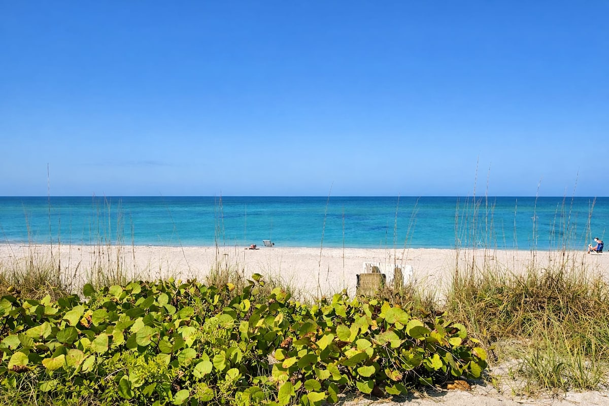 BOOK HERE!!! STEPS TO WORLD FAMOUS Manasota Key BEACH, FREE PARKING. Private beach access. WALKING DISTANCE TO MANY RESTAURANTS. 2 Bedroom, 1 Bathroom, beach themed condo with HEATED POOL access across street. Complimentary grill and Gulf sunsets. Your morning coffee is on us! Beach chairs, towels, and sand toys supplied. Kitchen is updated with filtered water, ice, and utensils supplied. Master Bedroom has a queen sized bed, pull out drawers and fireplace. Boat dock slip available upon request.