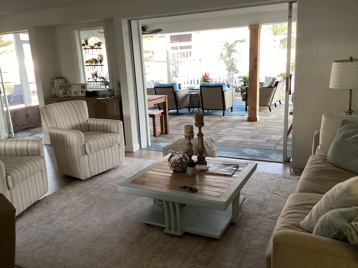 Welcome to Golden Girl. Our 3 bedroom 2 bath home is totally renovated with all new furniture. A 2nd level observation deck, private hot tub, bunkroom sleeps 6, two bdrms with kings, queen sleeper sofa in LR, laundry, high speed WIFI, all new appliances, smart TV's, so much more! Lanai opens up to semi private beach and a quiet neighborhood of single family homes. There is Bay access too. Kayaks available for rent. There is a separate apartment above not included. The location cannot be beat!