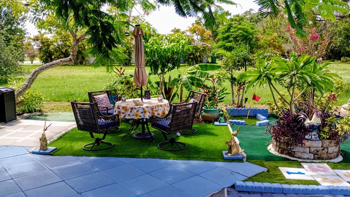 Welcome to Golf Cove Paradise ☀️ A peaceful resort style outdoor space + private + oversized solar heated pool creates a perfect vacation oasis. Covered lanai = shade. BBQ & watch your favorite sports on 55” outdoor tv. Walk the golf cart paths, swim laps, get a tan, read a book, play music & games, sip on tropical drinks & float all your cares away. Pretty sunsets overlooking a golf course setting. A.M. coffee outside to hear the birds sing. Carefree outdoor living is what it’s all about here.