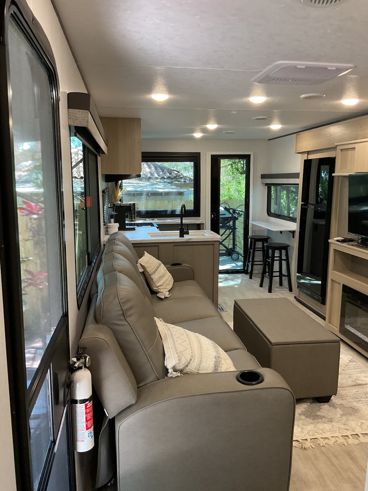 GLAMPING Just follow the tiki torches down a lush tropical path to a 2025 one bedroom 30’ RV. Enjoy the very private escape on a large lot shared with a 1920s historic home. You will enjoy the private off street parking. There is a short one block walk to historic “Bean Depot” Restaurant featuring live music. The 2025 RV is fully equipped. It is surrounded by a paver patios and lush tropical landscaping. There is also an attached deck with a pass-through window to the kitchen. The amenities