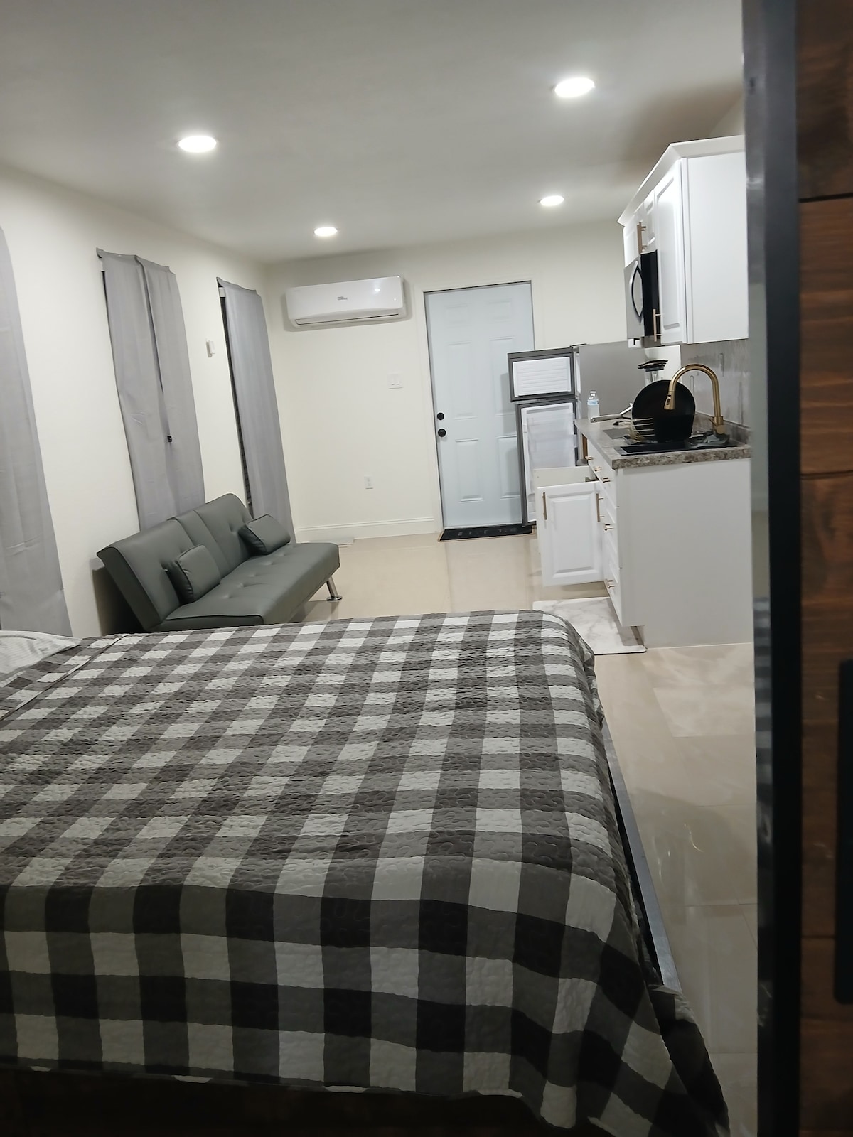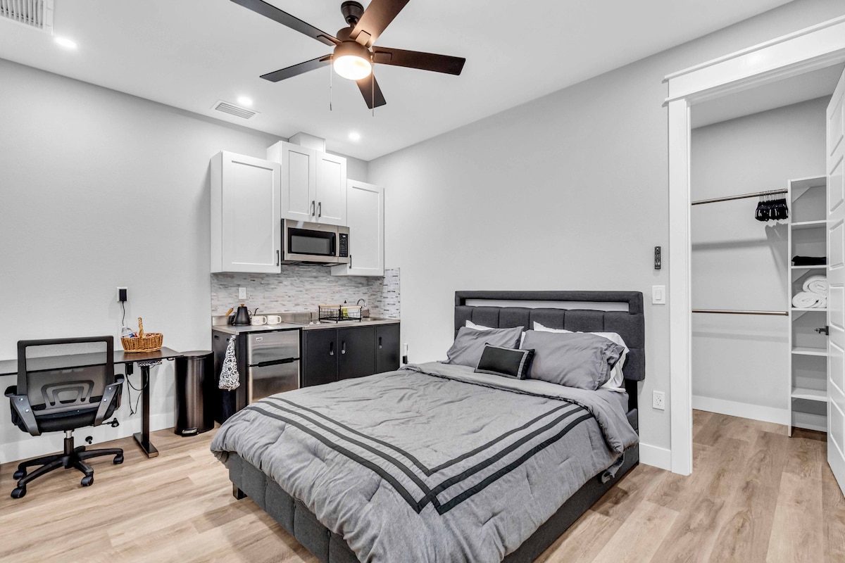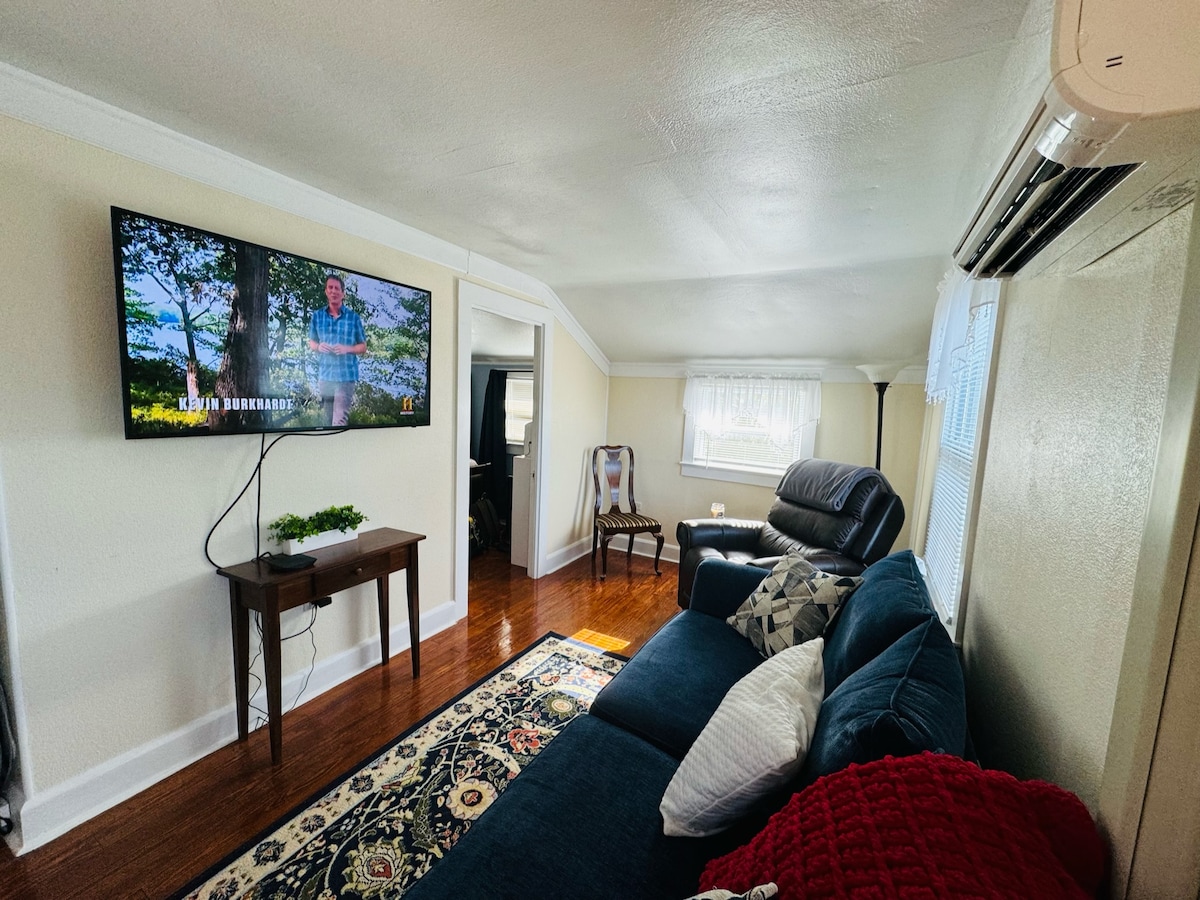 Take a break and unwind at this peaceful oasis. Enjoy a comfortable stay in this charming one-bedroom, one-bath suite, featuring a relaxing bathtub. The suite includes a private entrance, separate heating and air conditioning for personalized comfort, and a kitchenette with a small fridge/freezer, sink, microwave, and coffee maker. 55" smart tv, desk/work area, and WIFI included. The suite is attached to a main house. Suite offers all the essentials for a cozy, convenient stay.