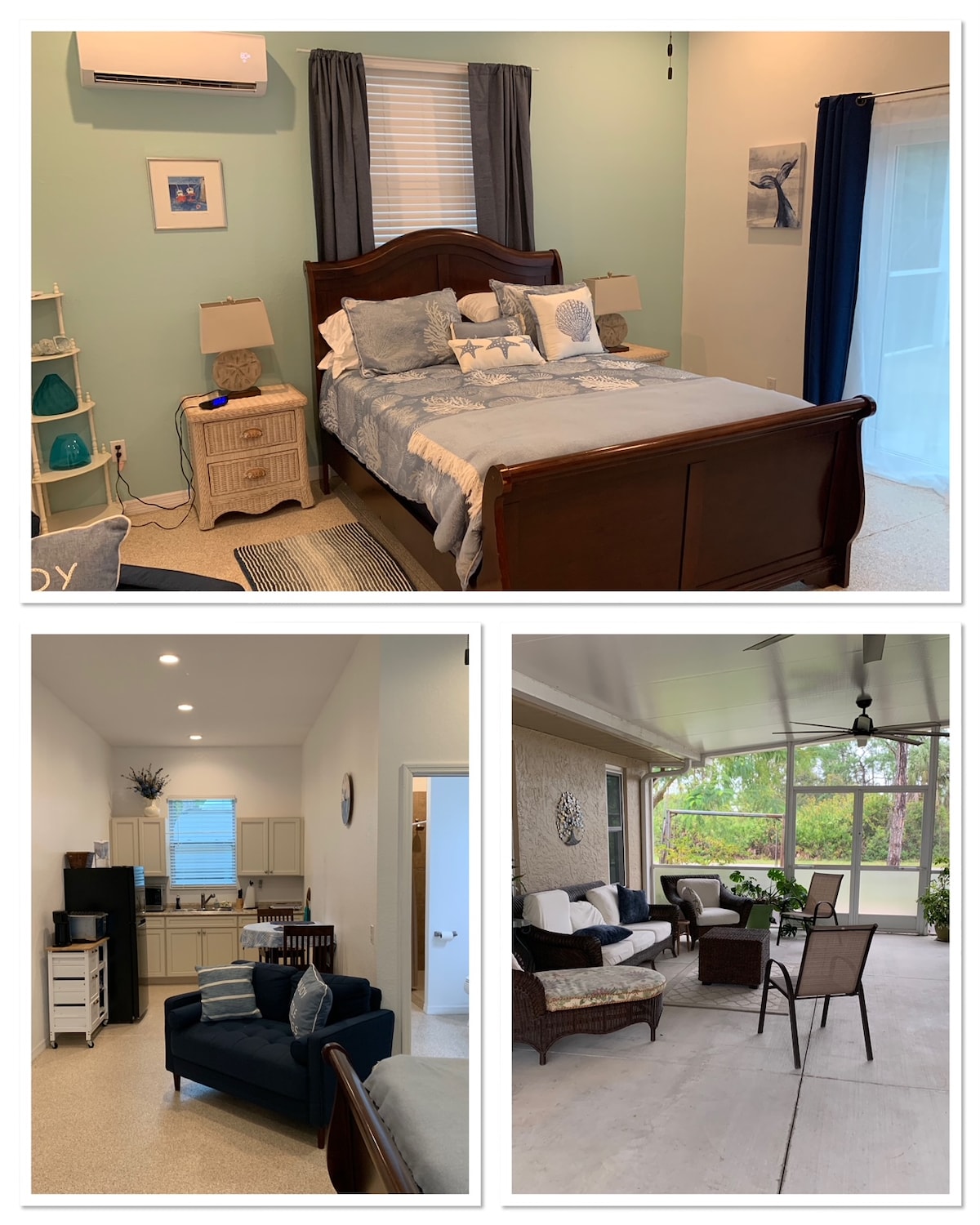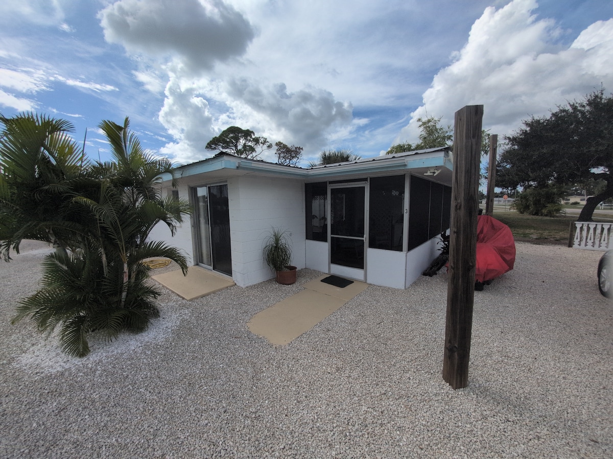Relax in this bright, coastal-inspired mini studio just minutes from Charlotte Harbor. Enjoy a comfy full bed, private bath, Smart TV, Wi-Fi, AC, and a small kitchen for light meals. Unwind on the shared patio or explore nearby parks, kayak rentals, trails, and Fishermen’s Village for dining and live music. Note: shares a wall with another studio, so some sound may carry. Compact but thoughtfully designed—perfect for solo travelers or couples seeking a cozy Gulf Coast stay.