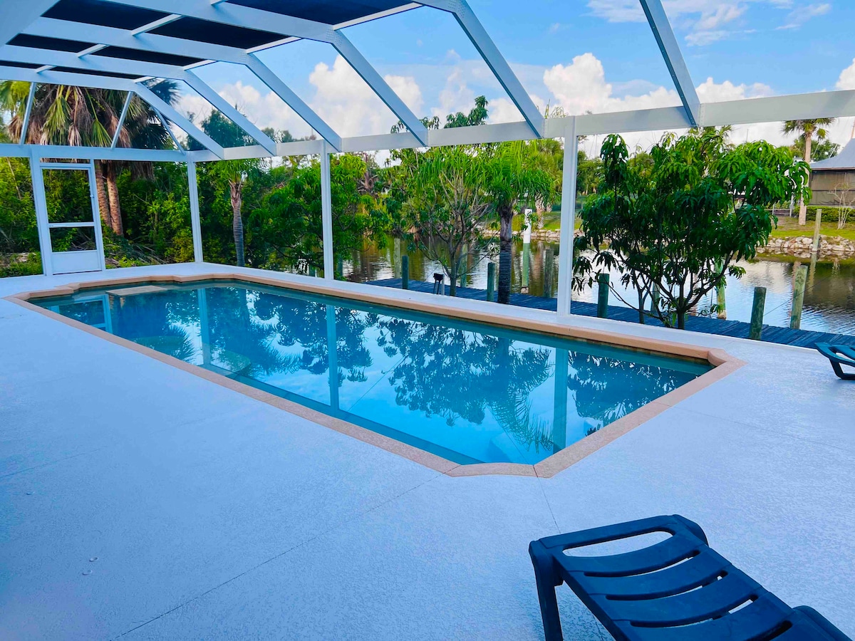 3 bedroom, 2 1/2 bath plus pool bath. Close to beaches, bike path, several golf courses. Brand new luxury vinyl flooring replaced all the carpets. Gulf access sailboat canalfront with fully screened lanai and awesome 36 foot heated pool. Brand new pool enclosure and deck paint. 60 foot dock behind house. POOL IS SHARED,. There are 2 units and both have access to the pool. Close to Boca Grande rentals for less than half the price. Sunrise and sunset views from the 2nd floor balconies