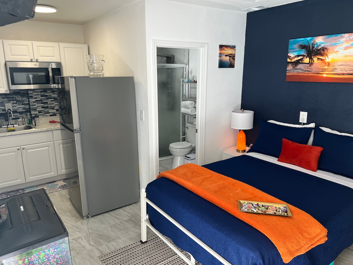 Experience comfort and style in this charming, pet-friendly space, perfect for short getaways. Enjoy the privacy of your own entrance, along with a full shower, cozy living room, dining area, and bedroom, all within one convenient layout. The fully fenced backyard, shared with other tenants, features a grill and fire pit—ideal for relaxing evenings outdoors. While the space includes a kitchenette, access to the main shared house may be available if you need a full kitchen or laundry facilities.