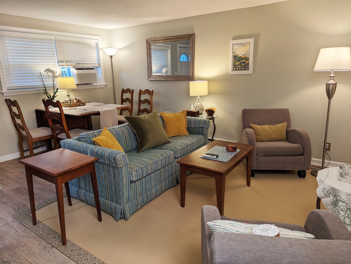 Private entry, quiet, historic, 3 blocks to Downtown Mall. 2nd floor suite, wood floor, queen bed; loveseat, electric fireplace, study w desk, 2 adjoining bathrooms-1 compact shower-one 4' clawfoot tub. Extra bedroom - $35/night. Private coffee room/library, compact refrigerator, microwave, ceramic cookware, cutting board, full dish set, flatware, wineglasses, electric kettle, pour-over coffee Chemex; locally ground coffee, bakery breakfast bread, NO KITCHEN or stove-Support local restaurants!