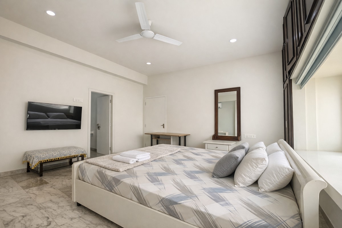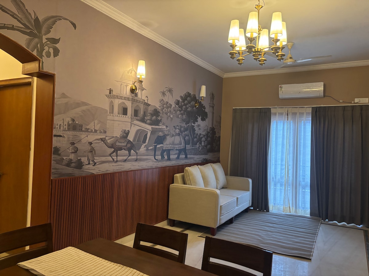 Welcome to your ideal home away from home. Our apartment is on the first floor of the villa without a lift, exclusively for the families only. Unmarried couples and Bachelors are restricted. Our apartment is spacious. A/C in both the bedrooms, with attached bathrooms. Featuring two spacious bedrooms, our retreat ensures a peaceful night's sleep . The master bedroom is with a king-size bed, while the second bedroom is with 2 Single beds, and two additional floor mattresses.
