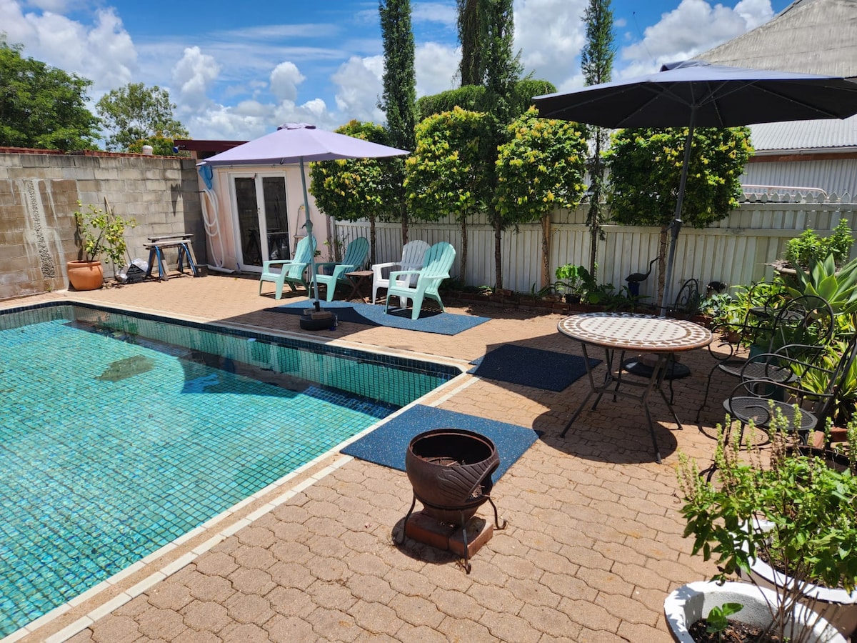 The whole group will enjoy easy access to everything they need from this large country styled home with only a 10min walk to the town center. This spacious and well-equipped house is ideal for traveling families, groups of contract workers or for short-term work trips up to 3 weeks. Counrty Palms has a comfortable outdoor dining table and patio, a generous fully fenced yard with a lush oasis garden, plus a large spacious driveway area to park vehicles inside and outside the house yard.