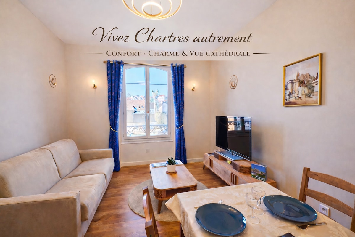 2 voyageurs-1 chambre-Wi Fi-Cuisine Appartement classé 3 étoiles situé près de la gare et à 5 minutes de la Cathédrale, Centre International du Vitrail, ...et de tous les commerces. Très reposant et au calme, il donne sur les toits de la basse ville de Chartres d'un côté et sur un espace vert de l'autre. D'une surface de 58m², il est entièrement équipé. Il dispose d'un lit deux places dans la chambre et d'un canapé convertible en lit dans le salon. English fluent.