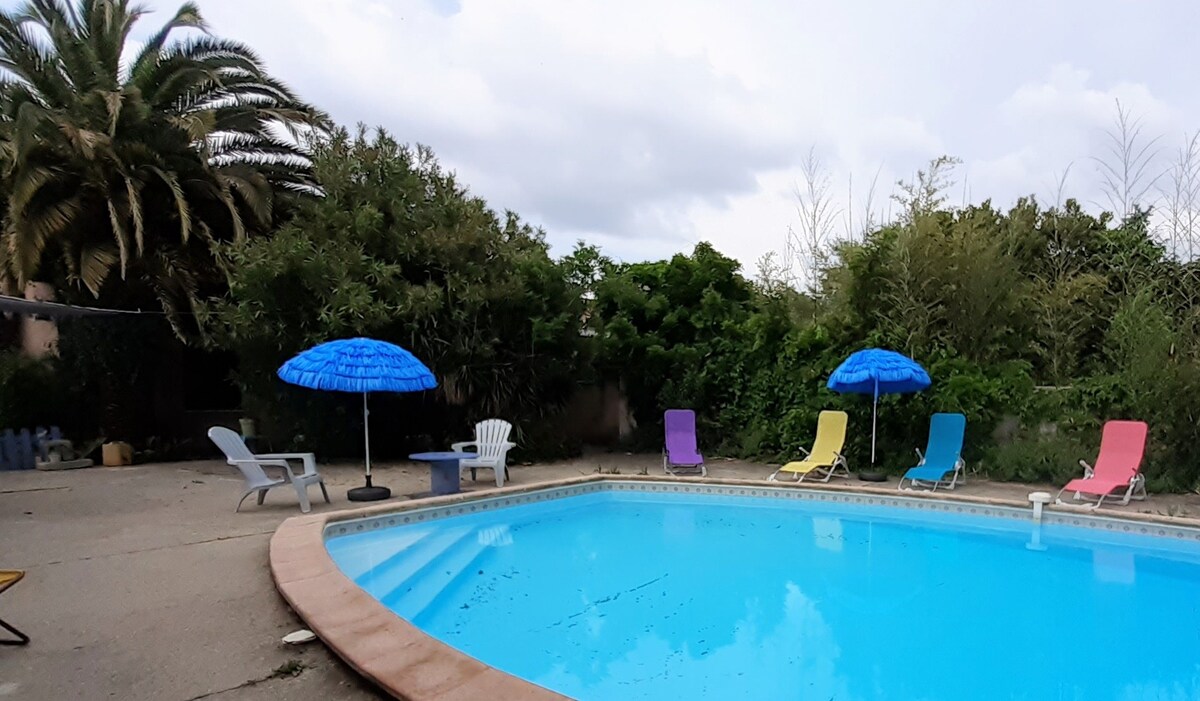 chalet climatisé au bord d'une piscine, dans un joli jardin au calme, équipé d'un lit double en 140 cm, d'une salle d'eau avec wc, d'une kitchenette avec frigo, plaque electrique, four, micro onde, cafetière nespresso, grill pain, presse fruit Petit écran plat avec TNT, Wifi Le linge est fourni y compris serviettes de bain piscine La piscine, les transats sont à partager avec les propriétaires Une place de parking non fermée est disponible Une plancha est mise à disposition