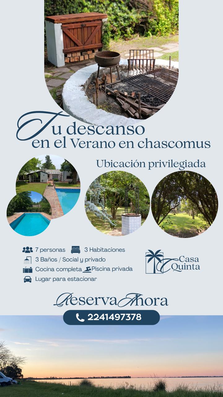 Un espacio exclusivo totalmente para vos, con pileta de 8 x 4 mts, parrilla y un amplio jardín. La construcción es nueva, cuenta con aire acondicionado, tv 32" ventiladores de pie, caloventores, cocina completa y heladera con frezzer. Disfrutá de la tranquilidad de Chascomús en un entorno de naturaleza y sol. El barrio es tranquilo, de casas quintas con calles de tierra y vasta arboleda. Conocé más sobre nuestros servicios en la descripción debajo. Cualquier duda estamos para asesorarte.