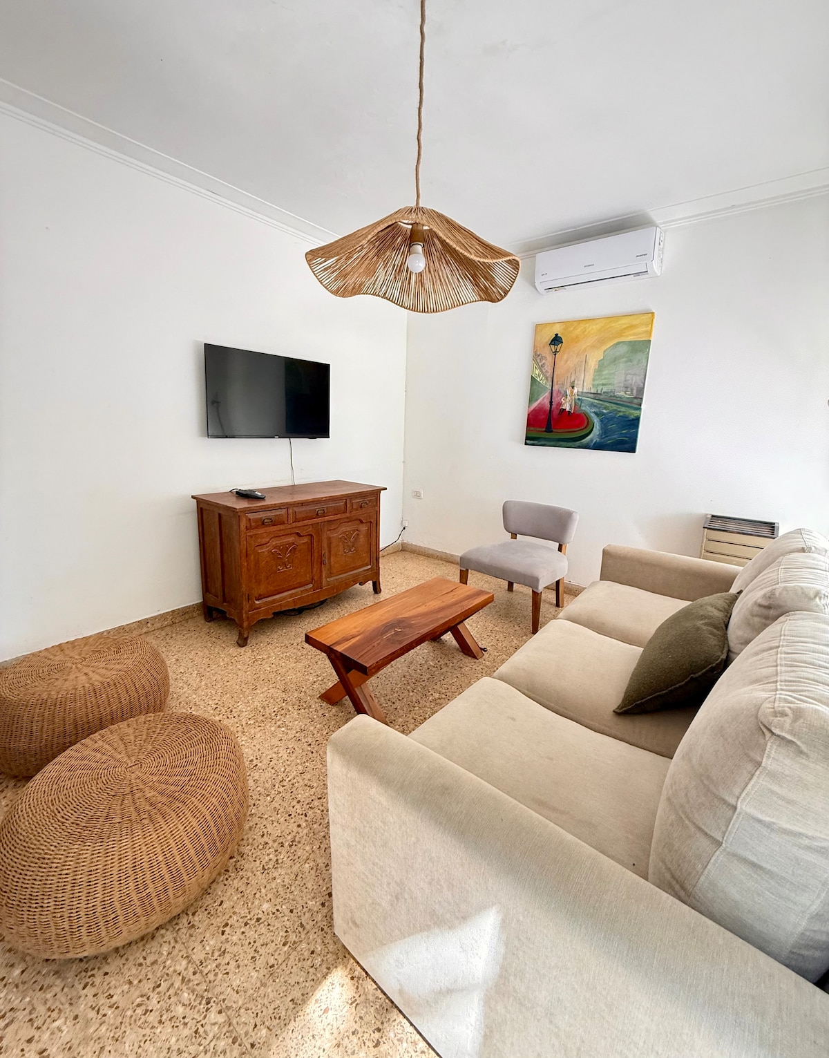 La casa está ambientada con muebles cálidos y confortables, el estilo es sobrio, madera, telas de colores claros y cuadros verdaderos junto a objetos con historia para creer ambiente de hogar.