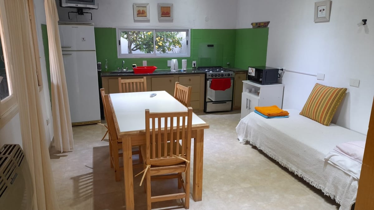 Disfruta de la sencillez de este alojamiento tranquilo y céntrico a tres cuadras de la laguna. Conoce los atardeceres mas lindos de la Provincia de Bs. As. Estamos a 114 km. de CABA Comodidades: Depto a estrenar para tres personas. Dos ambientes , cocina integrada, baño completo, living/ comedor con cama de una plaza, dos patios, parrilla, dormitorio con cama matrimonial, cómoda y placard, TV con cable y WIFI en ambos ambientes. No se aceptan mascotas. Encontrá aquí tu descanso, te esperamos!