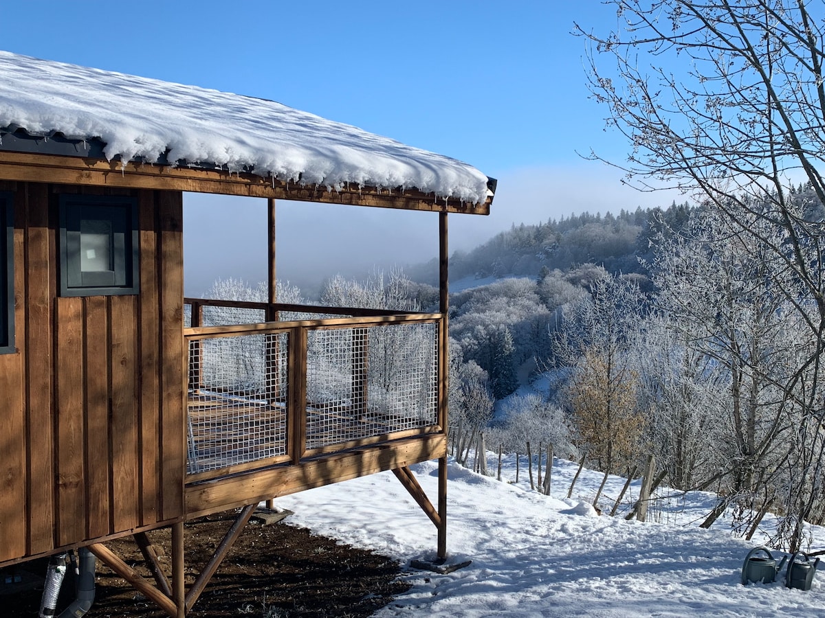 Cabane tout confort, entre lacs et volcans, au cœur du massif du Sancy, dans le Parc régional des Volcans d'Auvergne. Situé sur le GR30, à proximité des stations de ski et de nombreuses randonnées. Idéal pour passer un séjour atypique, proche de la nature. Entièrement équipé, ce lodge tout confort de 18 m2 est composé d'une cuisine toute équipée, un lit double ainsi qu'une salle de douche et WC . Lit fait à l'arrivée. Linge de toilette inclus. Plats traiteur et petits déjeuners possible.