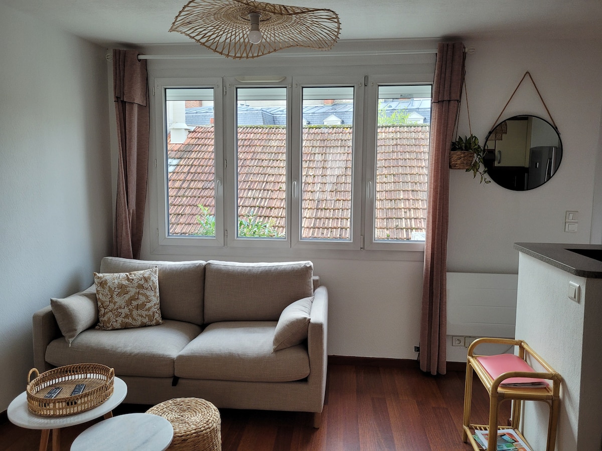 Le Logement : F2 de 38m² entièrement rénové comprenant : - une pièce à vivre avec coin salon canapé, TV, accès internet via wifi, une cuisine équipée avec four et plaques électriques, micro-ondes, frigo/congèl., cafetière, grille pain, bouilloire, vaisselle et tout le nécessaire pour cuisiner ou réchauffer. - une chambre avec lit double et dressing disponible - une salle de bain (douche, sèche-cheveux) et wc séparé Les draps et linges de toilette sont fournis Accès privé avec parking fermé