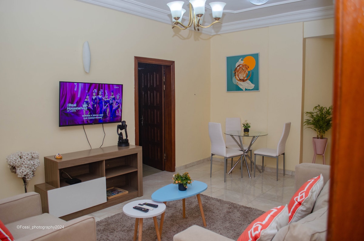 Profitez d’un séjour confortable à Maképé, Douala. Appartement spacieux et climatisé, idéal pour familles, collègues ou amis. Trois chambres confortables (2 Queen, 1 King), 2 salles de bain modernes, salon avec Smart TV 55", internet illimité, cuisine équipée et un balcon privé pour vous détendre. Situé dans un quartier résidentiel calme, immeuble sécurisé 24h/24 avec caméras et gardiens. Eau et électricité autonomes. Ménage régulier et assistance disponible en tout temps.