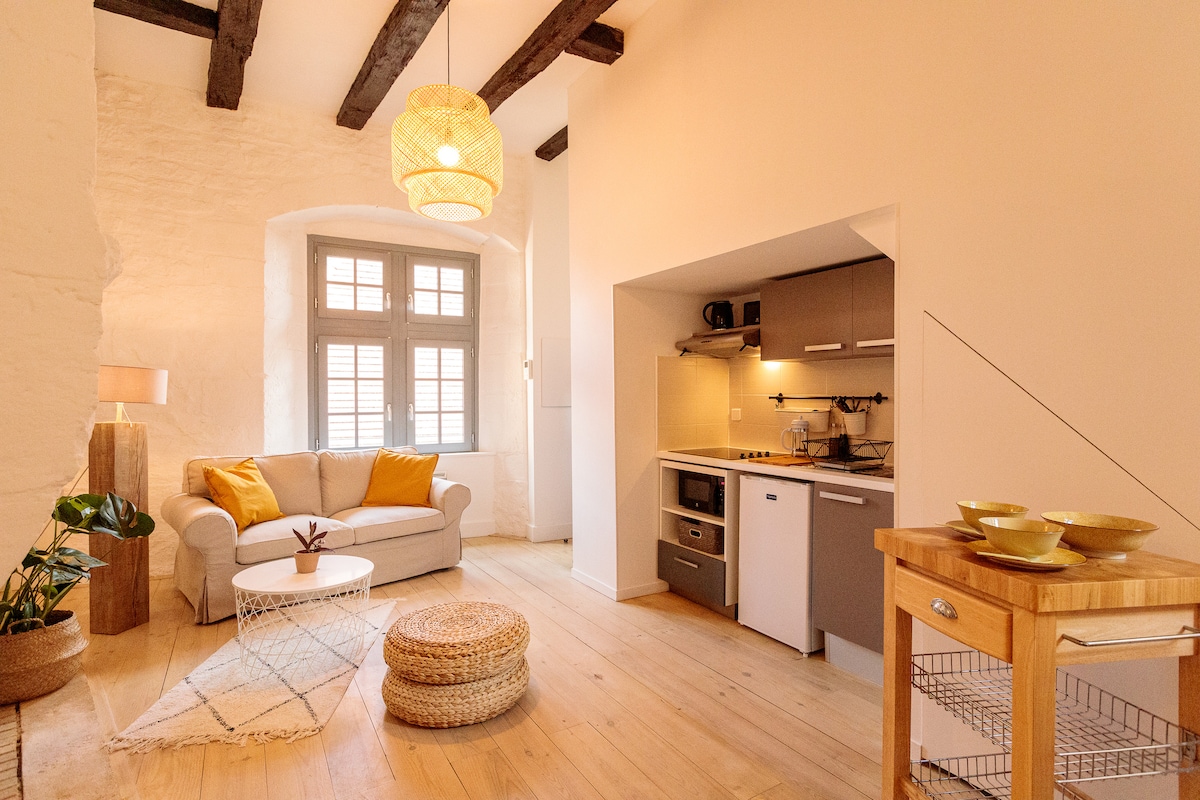 Appartement authentique de 50m2, plein de charme et de caractère situé au cœur de la cité médiévale dans une bâtisse du XVème siècle. Pour vous reposer après de magnifiques journées de découverte des environs, vous y accéderez par un splendide escalier en pierre d'époque et pourrez profiter de son vaste séjour ainsi que de son espace nuit atypique.
