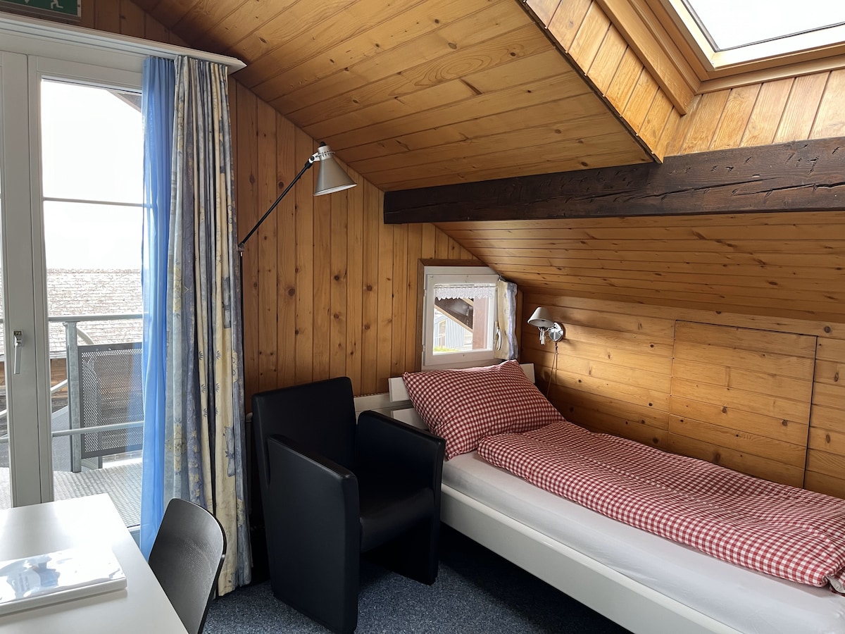 Das kleine Einzelzimmer ist mit 1 Bett, eingerichtet und hat ein Lavabo mit fliessend Wasser. Die Bett- und Frottée-Wäsche ist im Zimmerpreis inbegriffen. Das Zimmer hat keine eigene Toilette und Dusche! Toilette und Dusche zur gemeinsamen Benützung befinden sich auf den jeweiligen Etagen.