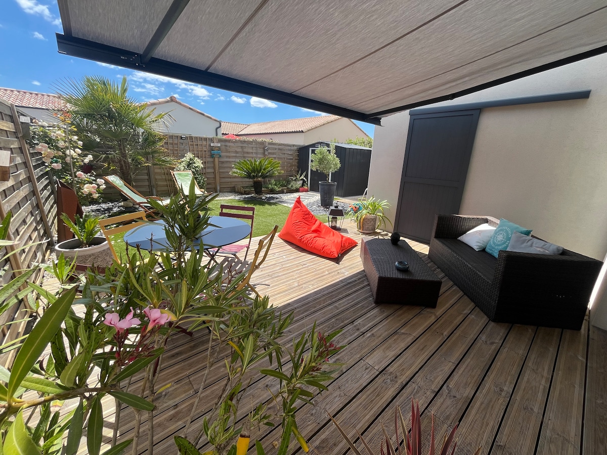 Maison de 32 m2, idéalement située, au calme d'une impasse. Piste cyclable sur l'arrière de la maison. A moins de 10 minutes en voiture des sites touristiques et naturels (baie des Sables d'Olonne, forêt d'Olonne-sur-Mer et marais salants). Stationnement devant le logement. Proximité commerce boulangerie, supermarchés. Maison tout confort composé d'une cuisine ouverte sur le salon , d'une salle d'eau avec WC, d'une chambre et d'une terrasse de 20M2 avec salon de jardin.