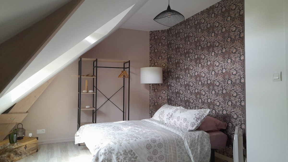 Vous serez logé dans une chambre privée avec un coin salle d'eau et WC privatifs, au calme, à l'écart de la circulation. Dans le prolongement de notre maison ancien corps de ferme rénové, vous accéderez à votre chambre par une entrée indépendante. Vous êtes en ville tout en profitant d'un coin de campagne. Parking gratuit à proximité. A 10 mn du centre-ville en voiture, à 5 mn d'un arrêt de bus. Commerces alimentaires, boulangerie à 5 mn.