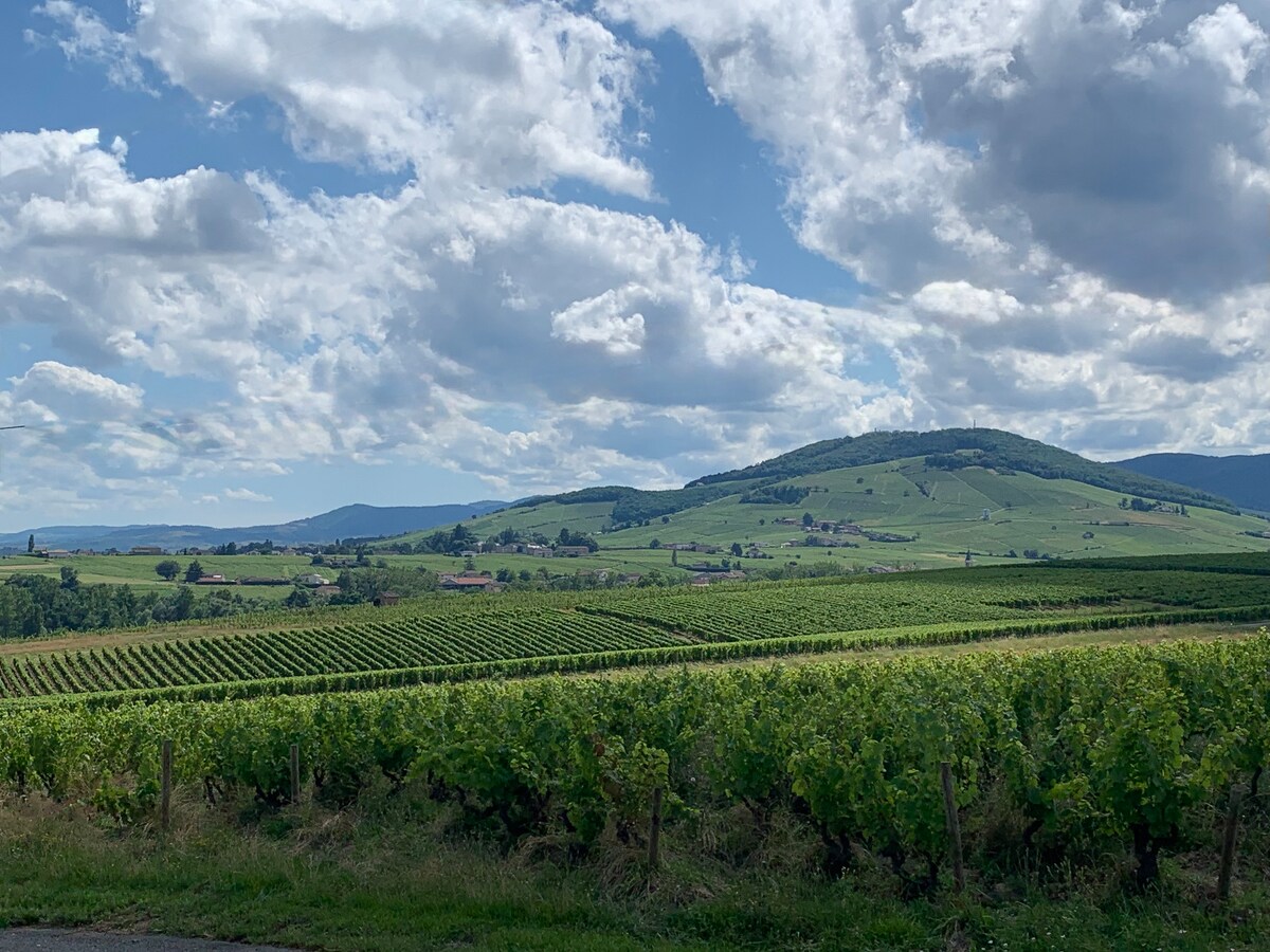 Petit havre de paix situé au cœur du Beaujolais dans une ancienne maison vigneronne. Profitez d'un cocon avec vue sur les vignes depuis votre terrasse, d'un parc arboré et fleuris de 5000m². Il est entièrement indépendant et voisin de la maison des propriétaires. Nous sommes à 8 min de l'A6. Idéal pour une pause en famille ou pour un séjour professionnel. A 10 min de Villefranche-sur-Saône (centre ville piéton le plus dynamique de France ) A 30 min de Lyon.