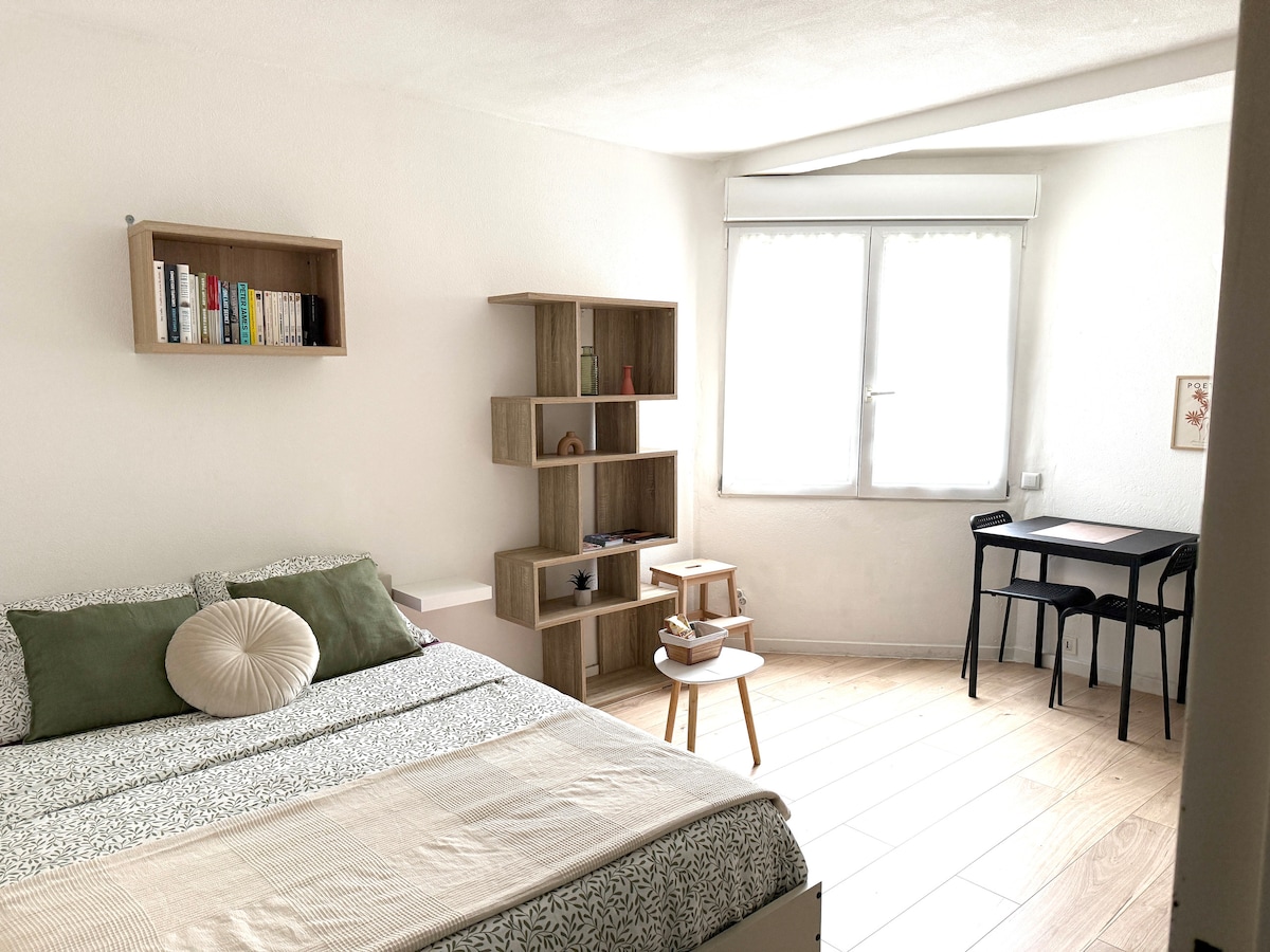 J'ai réalisé cet espace de vie comme si je devais y vivre. Très agréable, calme, lumineux. Les objets de décoration et d'aménagement sont chinés. Le logement dispose d'un balcon de 6 m exposé plein Sud et donnant sur les toits et les espaces verts situés derrière l'immeuble. Vous y trouverez une grande chambre mansardée, une cuisine ouverte sur le salon. Le logement se trouve dans l'hyper centre, vous pourrez faire vos courses dans le Carrefour City placé au rez-de-chaussée de l'immeuble.