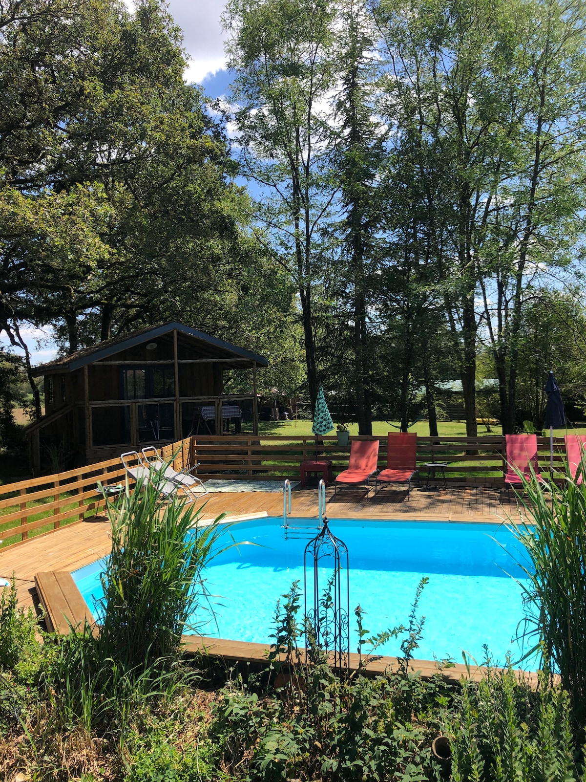 Léon vous invite à venir vous détendre dans cette cabane unique et tranquille au bord d'un étang dans son écrin de verdure. Chalet de 19 m2 avec lit 140 (+ lit appoint 1 pers ou lit bébé sur demande), coin cuisine équipée, douche, WC privatif à l'extérieur, chauffage, clim, ventilateur, terrasse ombragée, hamac, plancha... A disposition : barque gratuite, location de tandem, prêt de vélos pour balades, baptême en voiture ancienne Peugeot 203 sur réservation. Un animal tenu en laisse accepté.