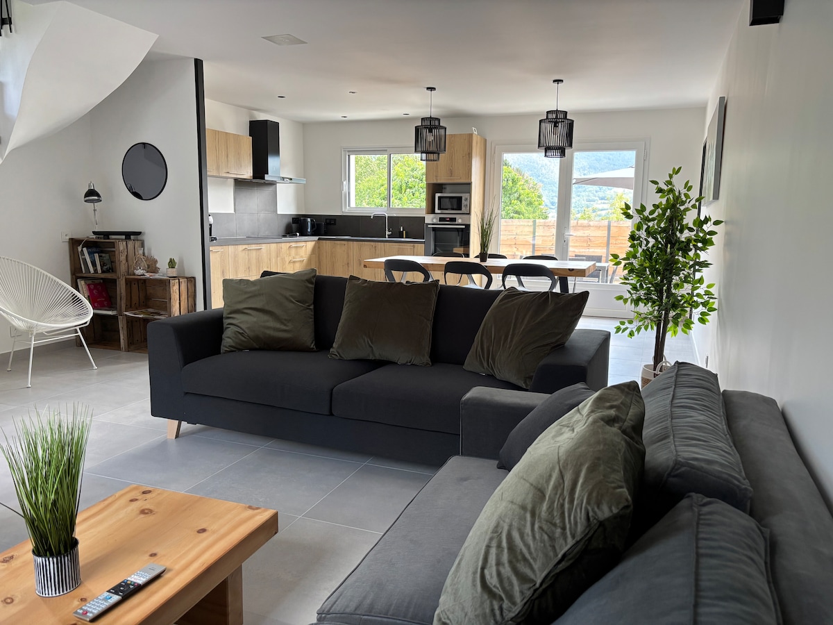 Appartement de 28 m2 entièrement rénové au 1er étage de notre maison dans quartier calme avec terrasse de 18 m² exposée sud, vue dégagée sur les montagnes. 1 pièce avec coin cuisine équipé, salon avec tv, wifi, canapé convertible, 1 chambre avec un lit double (140x190cm) et deux lits superposés (90x190cm). 1 salle de bain avec douche et wc. Logement idéal pour 2, possible jusqu’à 4 personnes. Stationnement sur parking privé. A 900 m du centre ville et gare.