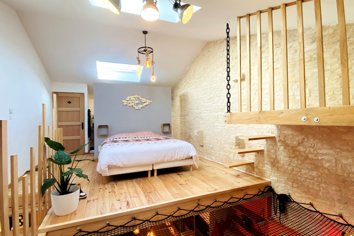 Ce Loft en duplex de 30m² (5min à pied de la plage), est fait et pensé pour un séjour bien-être à 2. Un véritable jacuzzi privatif, une salle de massage, lit queen size avec vue sur les étoiles et un jardin privé de 25m². Quartier très calme. Très Cosy, ce duplex est très bien équipé : cuisine aménagée, coupes à champagne, tout pour diner et petit déjeuner, micro-ondes, nespresso, canapé, tv connectée, leds, wifi, enceinte assistant vocal, spotify, wc séparé, douche, sèche serv, ext intimiste.