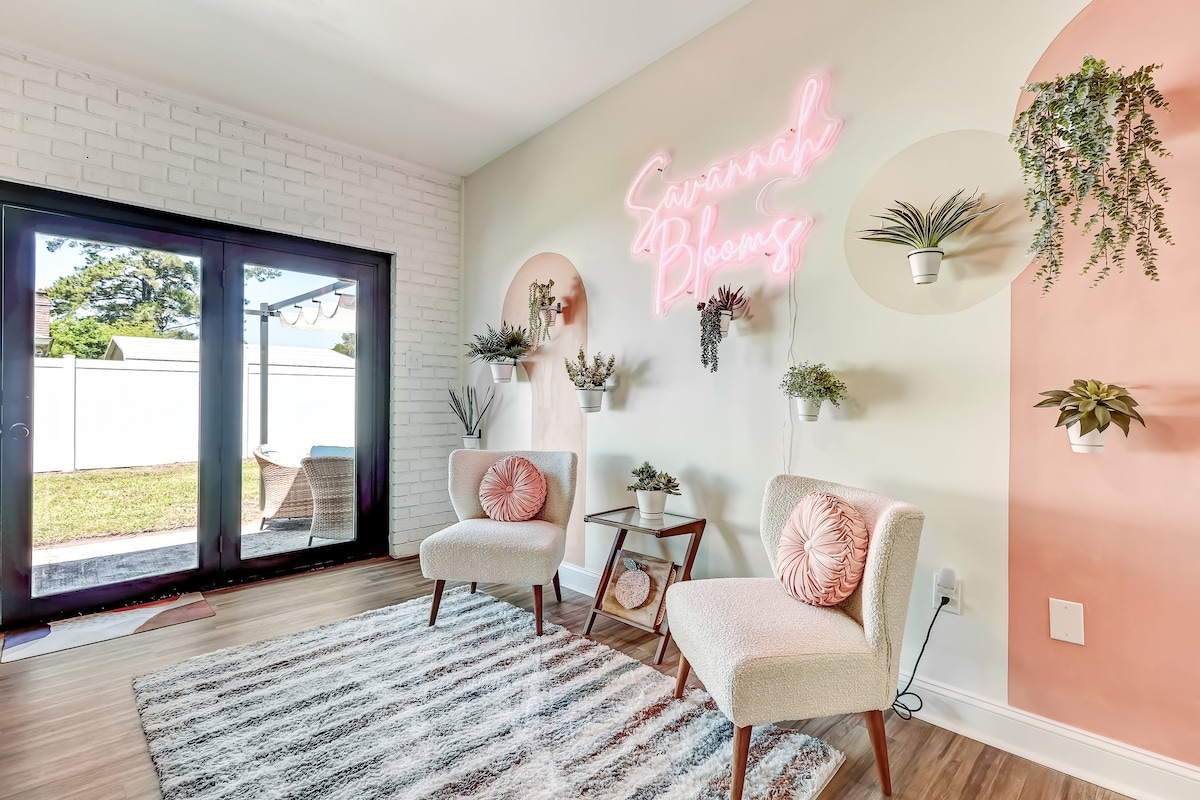 The Pinterest-worthy retreat for your group in a quiet peaceful neighborhood just outside of Savannah. Spend time in the backyard playing outdoor games or relaxing under the pergola. Move inside to enjoy the spacious, mid-century modern design throughout the living spaces and bedrooms. Kitchen is fully stocked so you can cook if you want! We are just minutes from Savannah Airport & Pooler, 20 minutes from downtown Savannah, 45 minutes from Tybee Island and 50 minutes from Hilton Head.